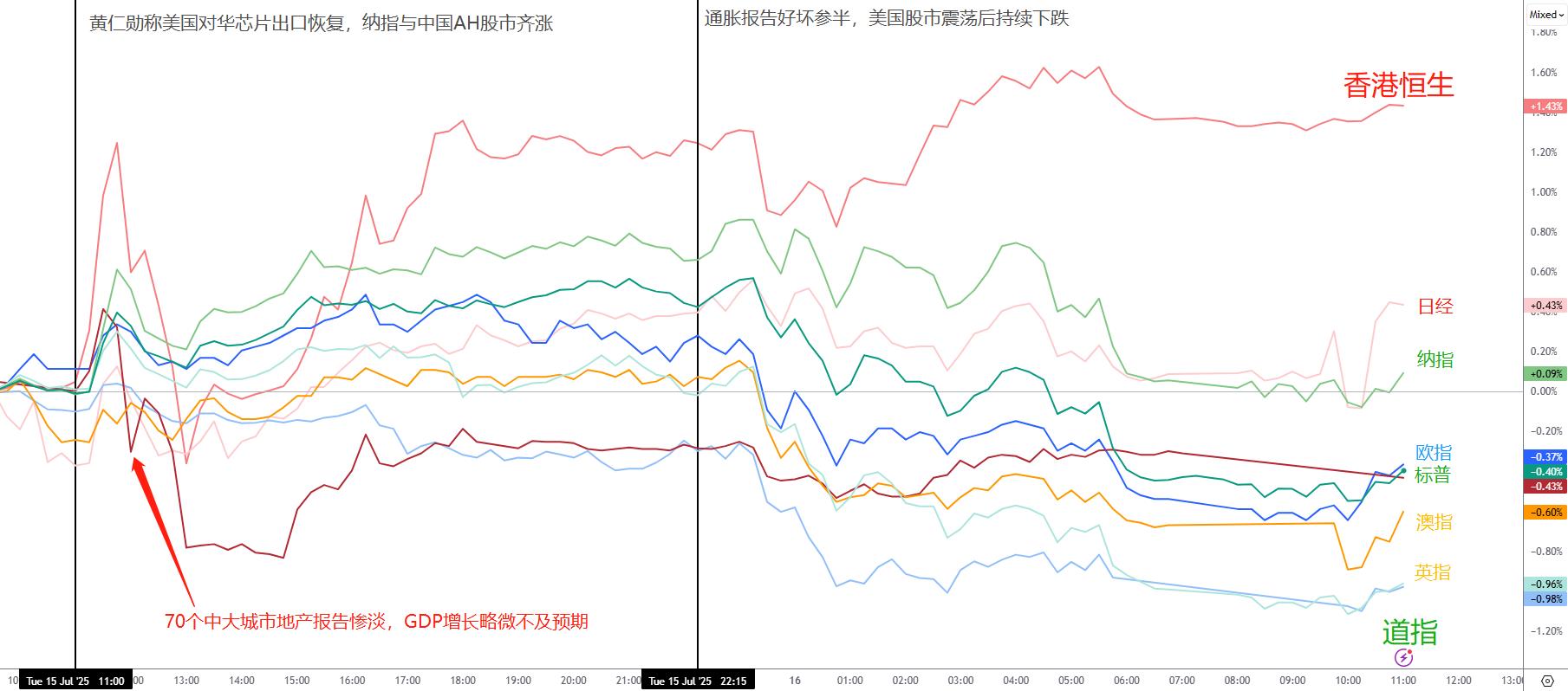中国AH股市:走势一波三折。早盘市场一度受到芯片出口恢复的利好提振,但随后疲软的地产数据与GDP报告迅速打压情绪,股市很快回吐涨幅。不过,可能由于市场对此已有一定预期,午盘起走势明显回稳。AH股市双双回升(铁矿石价格也跌深反弹)。尤其港股在科技板块带动下逆势大涨,几乎未受美股下跌拖累,涨势延续至今早开盘,最终大幅收涨,全天表现最佳。相比之下,A50指数受地产与GDP拖累更大,反弹受限,但在美盘期间也未跟随美股走弱,最终仅小幅下跌。