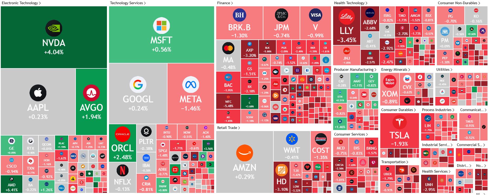 就像昨天美股分析中提到的那样,早盘时黄仁勋突然透露,美国已批准向中国出口H20芯片,这一消息直接推动纳指早盘再创新高。英伟达股价开盘跳涨,带动AMD、应用材料等一众芯片概念股集体开盘跳涨,但开盘跳空仅限于芯片板块。由于通胀报告令美债利率大幅飙升,触发市场对美股估值的剧烈调整,包括科技在内的十一大板块开盘后一路下挫。