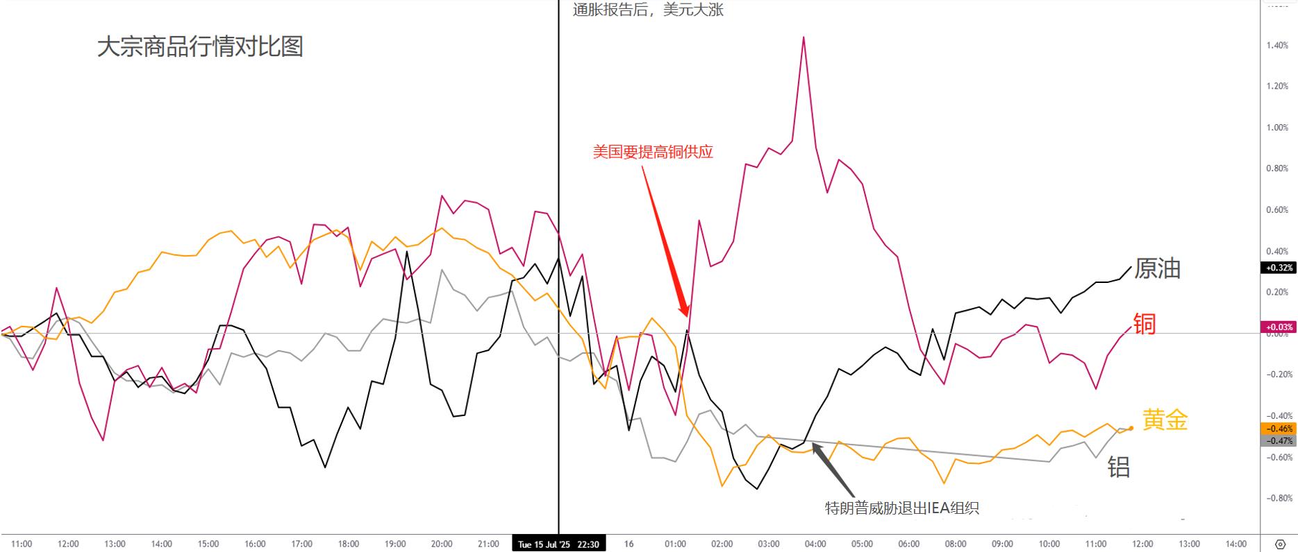 在强势美元的压制下,大宗商品在美盘时段普遍承压,其中黄金受打击最重,最终大幅下跌。铜与原油则因美盘消息面止跌。美国能源部长表示计划加速扩大铜产能,带动铜价一度冲高,但随后迅速回落。特朗普则在通胀报告发布后威胁退出IEA国际能源署,批评其在绿色转型上过于激进、抑制传统石油需求。考虑到通胀报告中能源价格大幅上涨,这一表态耐人寻味,或反映特朗普对能源价格攀升的强烈不满。受此影响,原油价格触底反弹,最终小幅上涨。