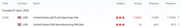 • Growth vs Inflation Mix: Latest data underscore a stagflation risk. U.S. manufacturing contracted in March (ISM < 50) and job openings fell, lower than the previous and forecast, signaling cooling growth.