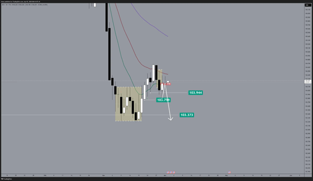 Traders are torn between the greenback’s typical haven status and the fact that this tariff shock originates in the U.S. economy. As a result, sentiment on the Dollar Index is mixed: it’s holding in a range as markets await clarity on how severe the economic fallout from the tariffs will be. As of now, Dollar is still in a range-bound stance since Friday, trading between 104.40 - 103.75.