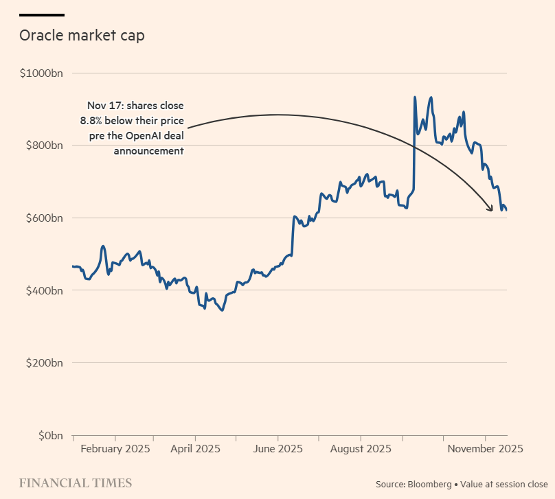 Oracle đang đối mặt với nhiều thách thức sau khi công bố thỏa thuận trị giá 300 tỷ USD với OpenAI vào ngày 9/10. Kể từ đó, cổ phiếu của hãng đã mất khoảng 315 tỷ USD giá trị thị trường, trong đó riêng quý vừa qua khiến vốn hóa giảm thêm 60 tỷ USD.
