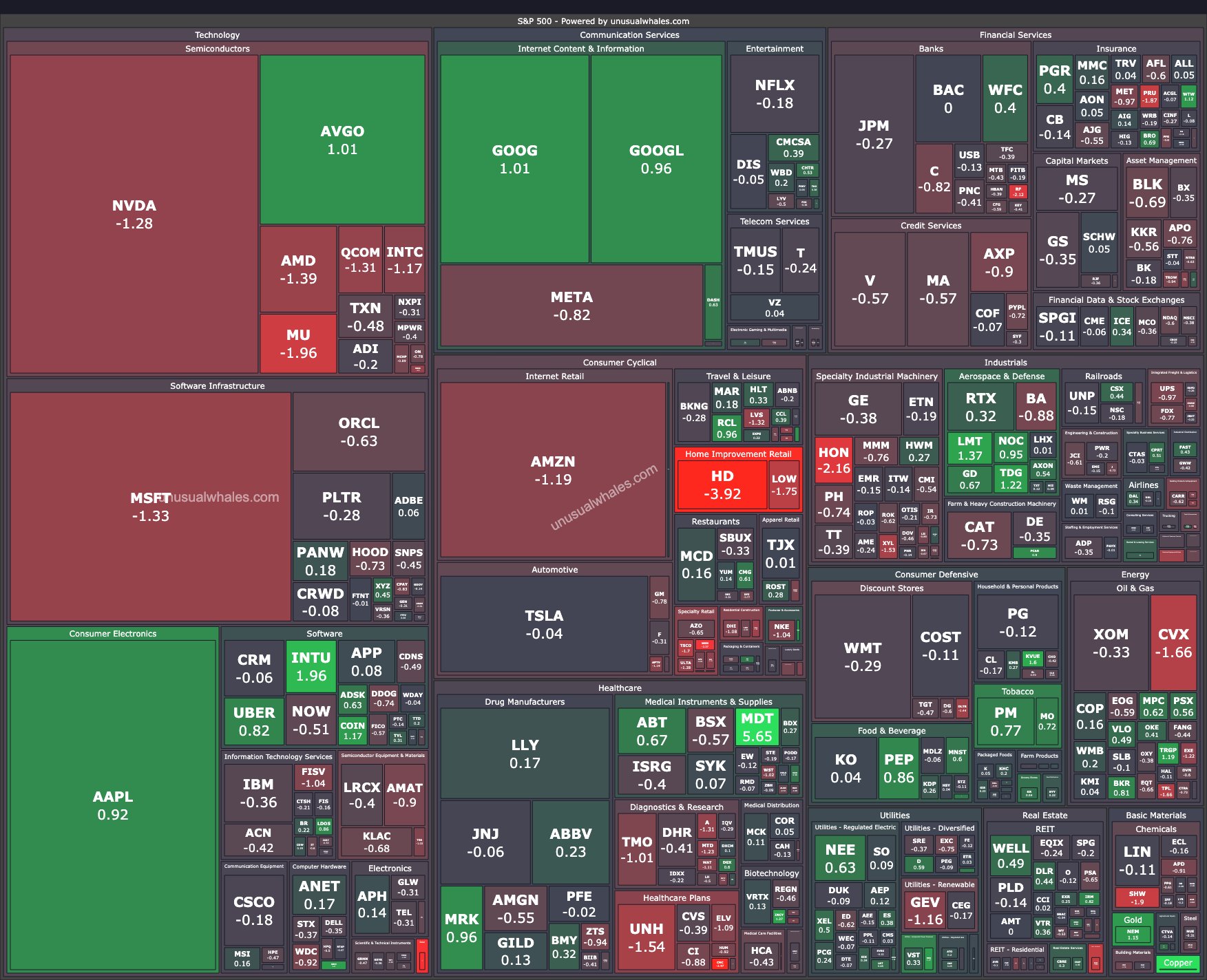 Tuy nhiên, góc nhìn vĩ mô lại mang màu sắc tích cực hơn cho các nhóm ngoài công nghệ. Các yếu tố như kỳ vọng cắt giảm lãi suất và bơm thanh khoản đang hỗ trợ dòng tiền dịch chuyển sang các ngành năng lượng, tiện ích, y tế và tiêu dùng thiết yếu. Heatmap hôm nay cũng củng cố xu hướng luân chuyển này, cho thấy thị trường vẫn duy trì sự ổn định ở các lĩnh vực ngoài tech.