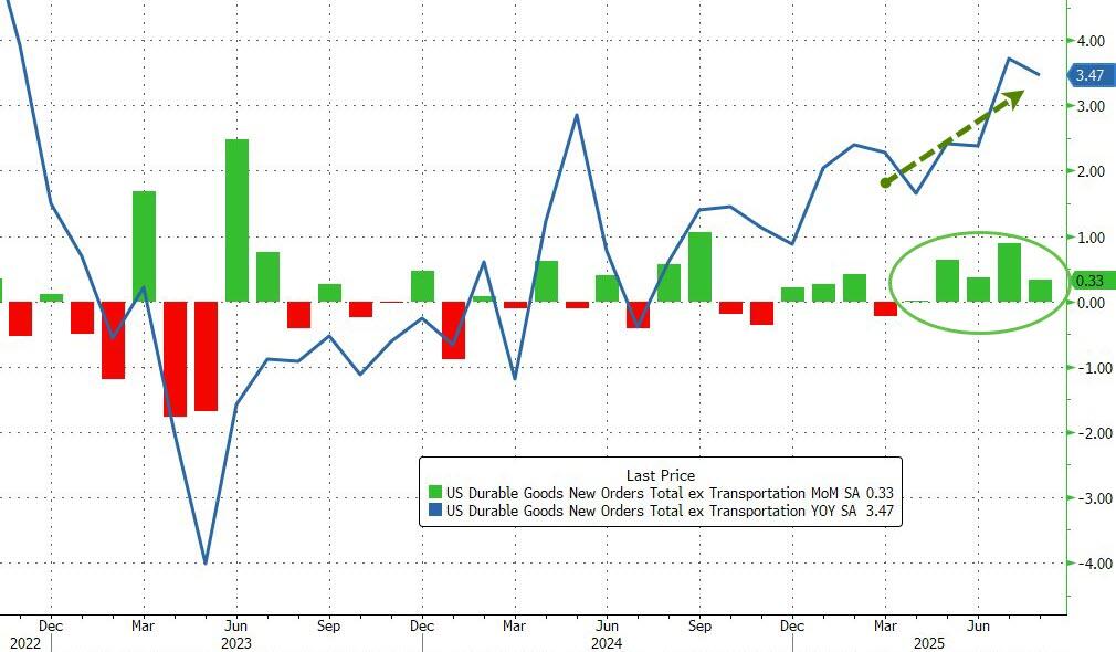 Đơn đặt hàng hàng hóa lâu bền (không bao gồm vận tải) cũng tăng +0,3% MoM, thấp hơn mức dự báo +0,4% nhưng vẫn duy trì đà tăng ổn định trong suốt 5 tháng liên tiếp.