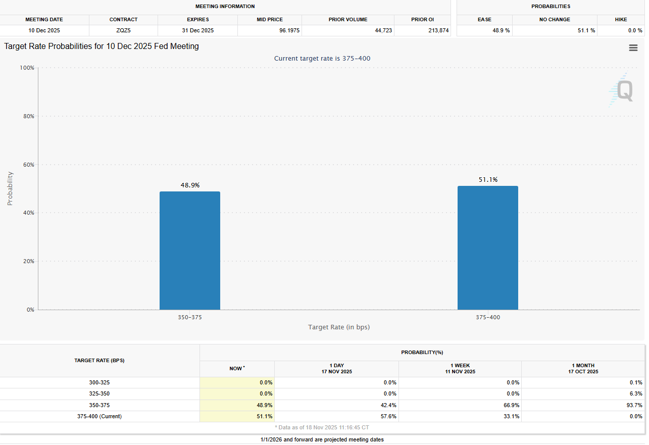 Diễn biến này góp phần làm tăng kỳ vọng về khả năng FED sẽ cắt giảm lãi suất trong tháng 12, với xác suất được thị trường định giá nhích lên 53,6%, so với mức 45% của ngày hôm qua.