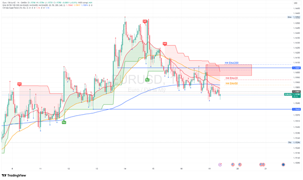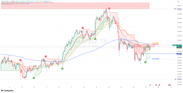 Giá vàng tiếp tục bật tăng trở lại khi chạm vào H4 EMA200, nhưng hiện tại đã bị chặn đứng trước ngưỡng kháng cự 4070. Đà tăng giá trên H4 đã mất đi khi EMA20 cắt xuống EMA50. Xu hướng vẫn nghiêng về giảm. Kỳ vọng giá sẽ gãy vùng hỗ trợ 4040.55 để tiếp tục bán xuống.