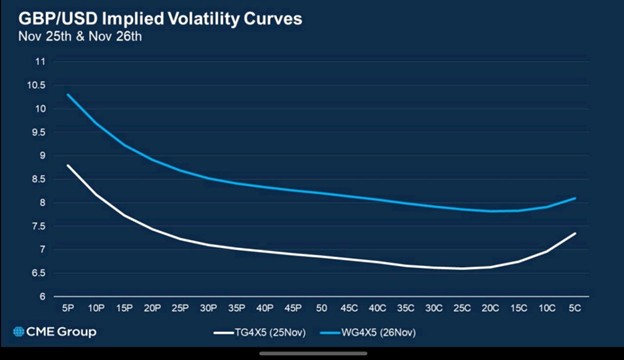 Volatility curve của quyền chọn GBPUSD đang nghiên hẳn về bên trái cho thấy các tổ chức phải mua put để hedging. Giá được kỳ vọng tiếp tục giảm.