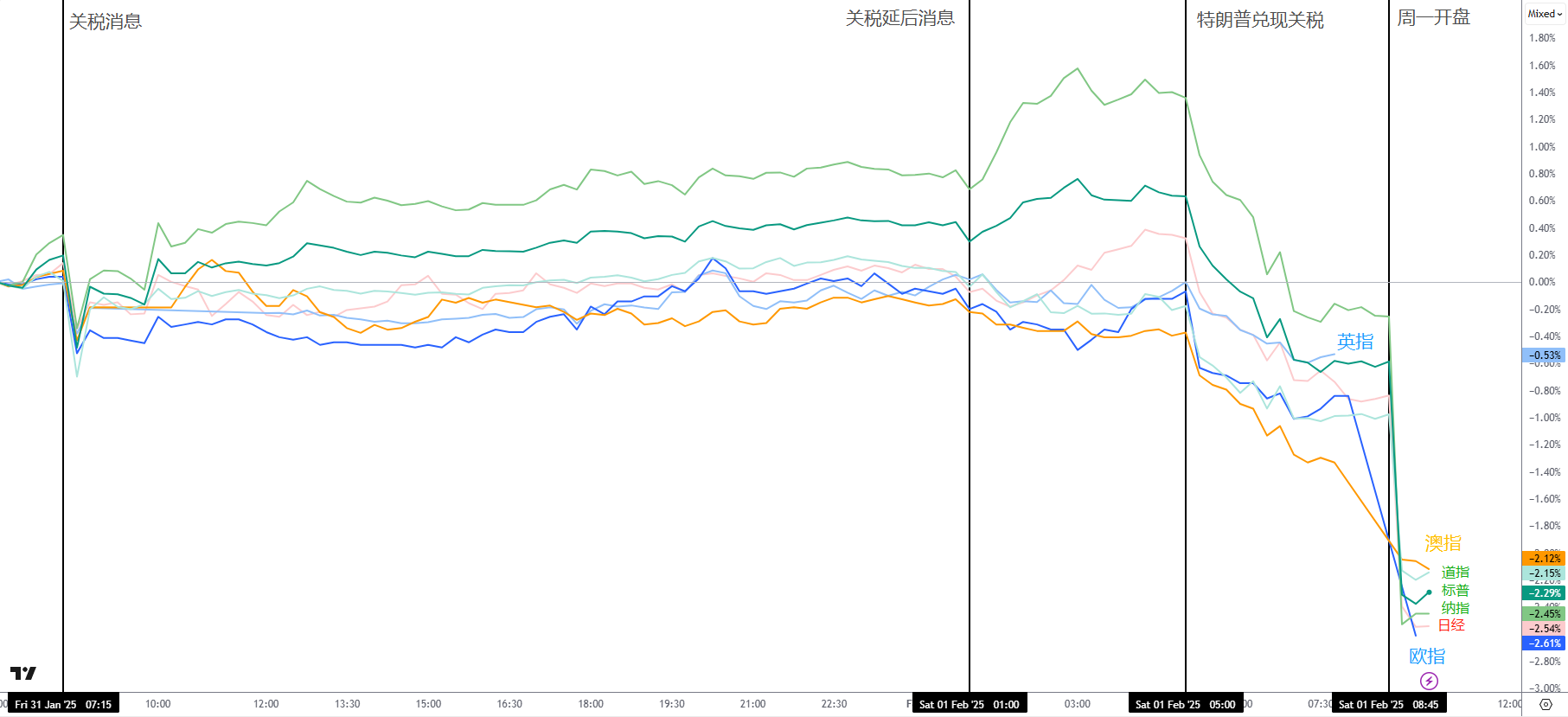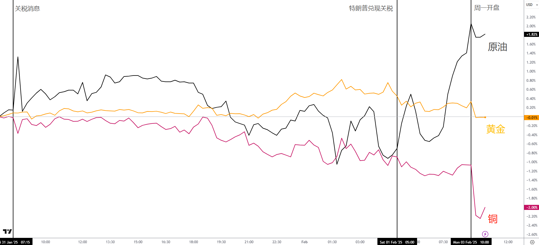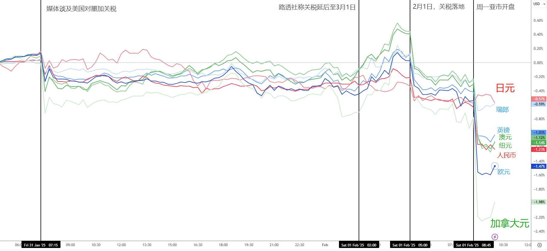 2月1日,特朗普的关税还是来了。不意外,美元大涨,非美、股市与币圈大跌,唯独原油跟着上涨。日元与瑞郎倒是抗住了压力,但可能好景不长。