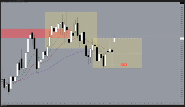 The Japanese Yen is now testing the 760 resistance level after a boost from tariff announcements. The Yen gapped up at Thursday’s trade open following the announcement, reflecting a surge in demand