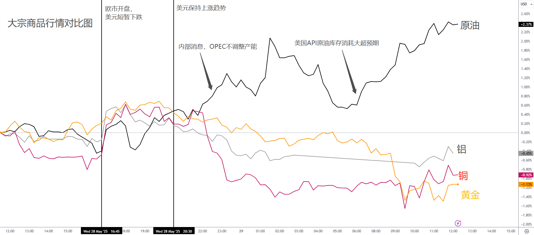 大宗商品还是受到美元的驱动。美元欧盘短暂下跌后,全天保持上涨趋势,大宗商品则是在欧盘短暂上涨后,全天保持下跌趋势。唯独原油价格持续上涨,受到两方面消息面影响,分别是有内部消息称OPEC本周会议不会调整产能,以及美国API原油库存消耗量大超预期,令油价呈现两段式上涨。