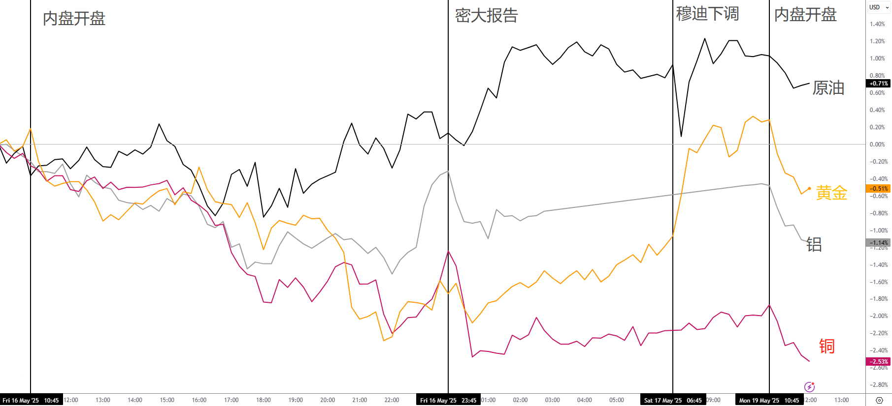 大宗商品普遍不受穆迪下调美债评级的影响,这是因为大宗商品是期货,更多受到供需影响,而不像外汇、债券、股票以及其他资产容易受到美债利率的影响(因为要进行未来现金流折现)。唯独黄金受到避险需求影响而上涨,和四月中旬一样。