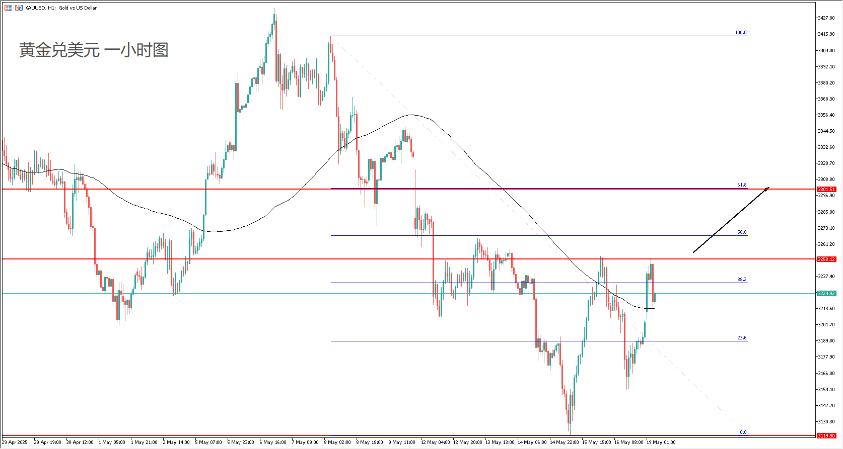 技术面:100均线向下但动能放缓,考虑到穆迪下调评级属于美债的极端风险,金价存在情绪面上涨的可能。但大宗商品市场整体承压限制了金价的动能。交易策略应该等待价格向上突破后再行看涨。现价已经两次测试3250关口,低点不断上升,一旦突破便形成了双底结构,理应顺势看涨。不过在没有突破斐波那契0.618回调线3300大关之前,应该以波段看涨为主。