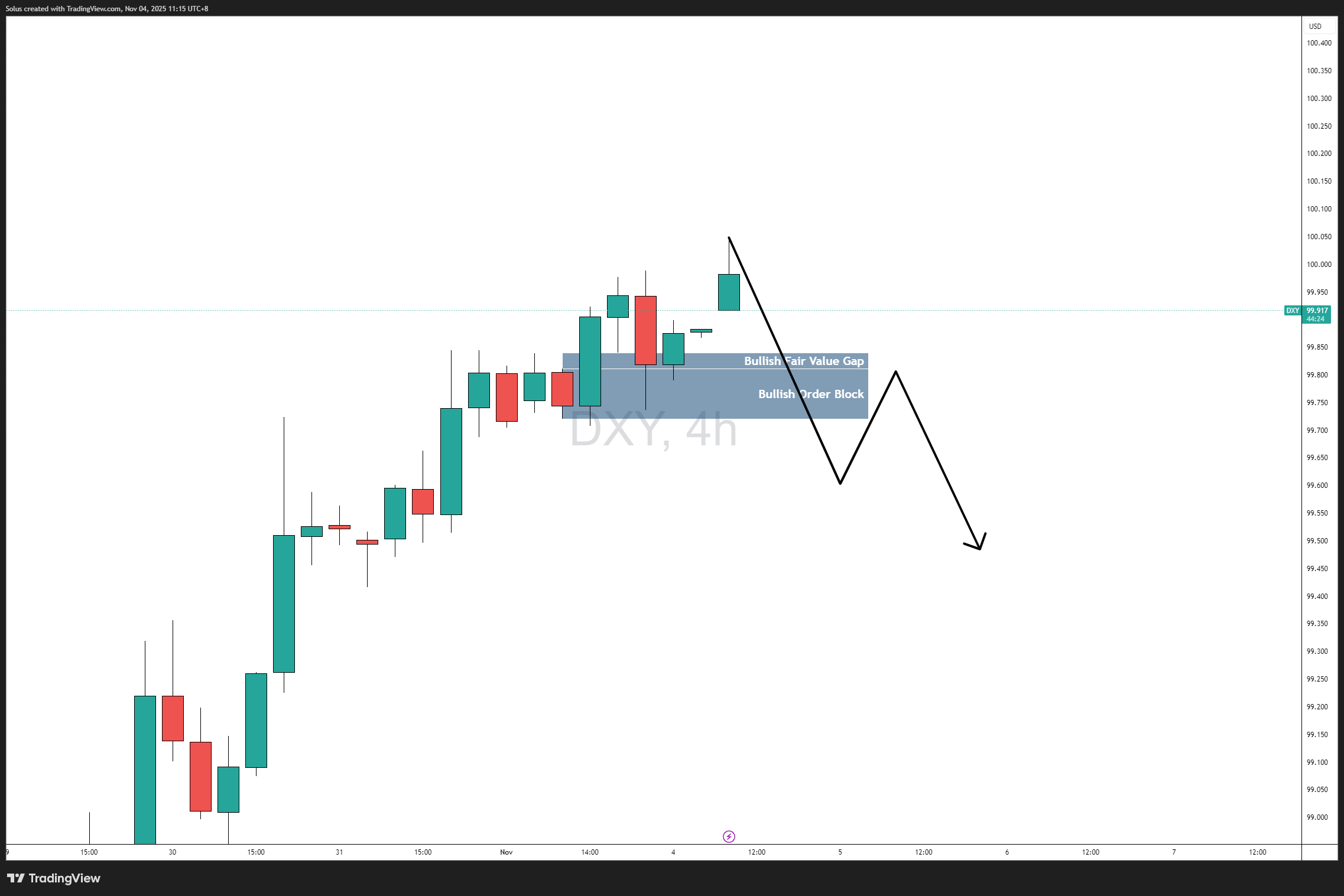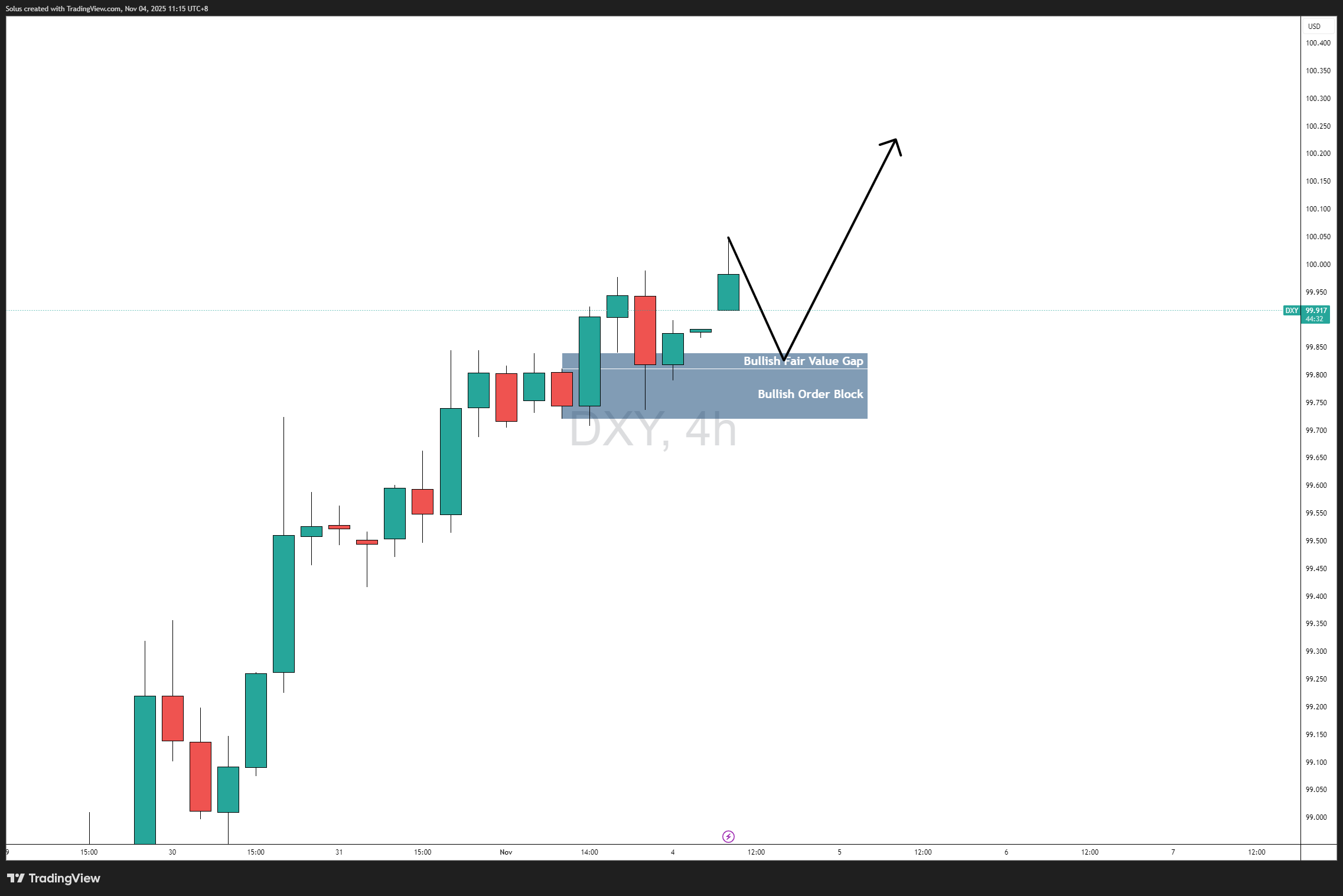 The DXY 4-hour chart shows price consolidating just above a Bullish Fair Value Gap (FVG) and Bullish Order Block (OB) within the 99.60 – 99.90 zone.
