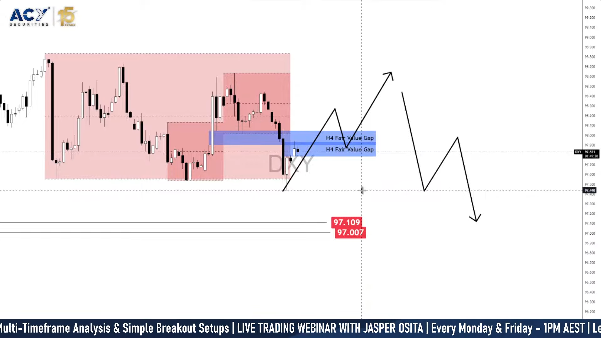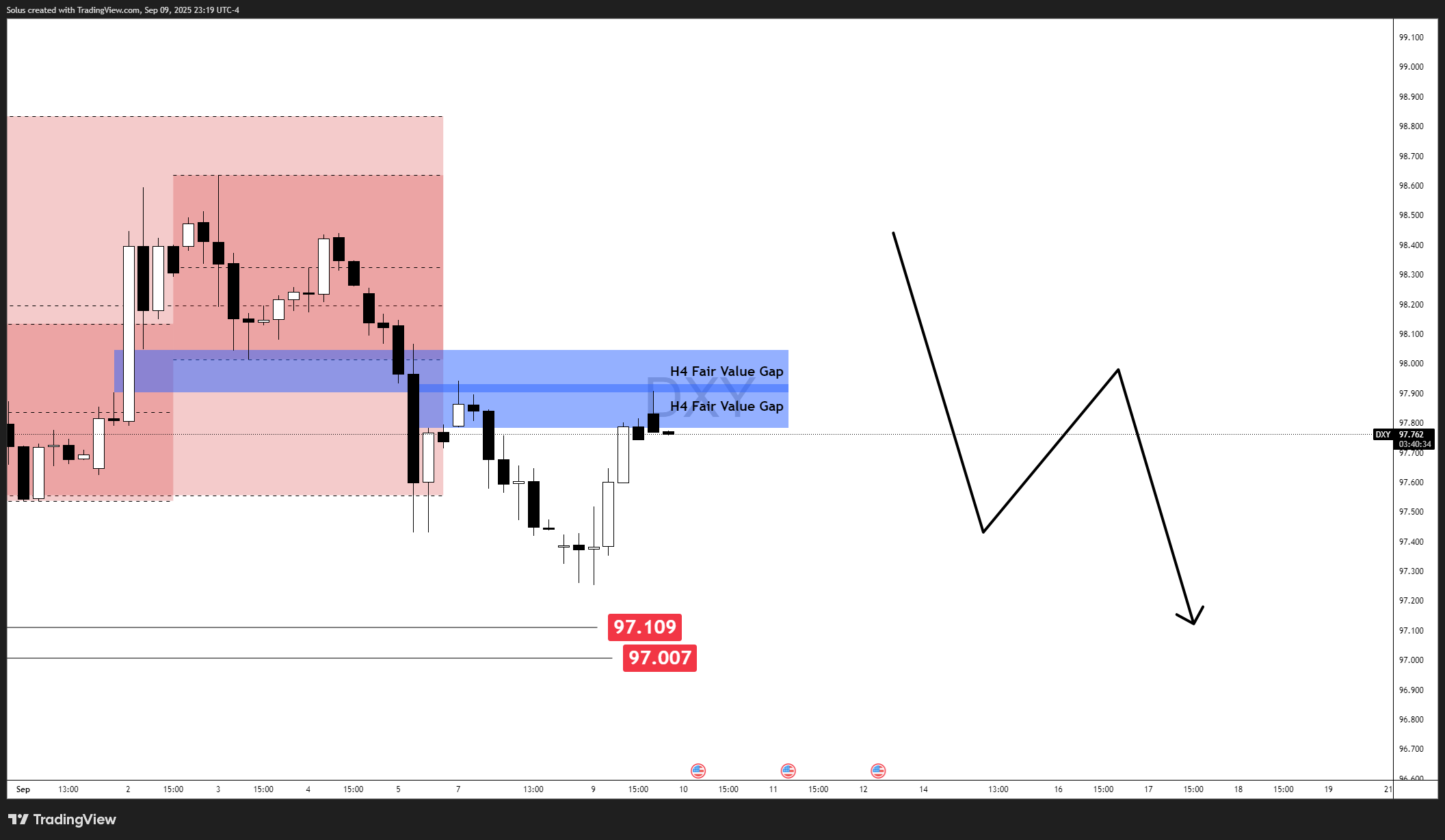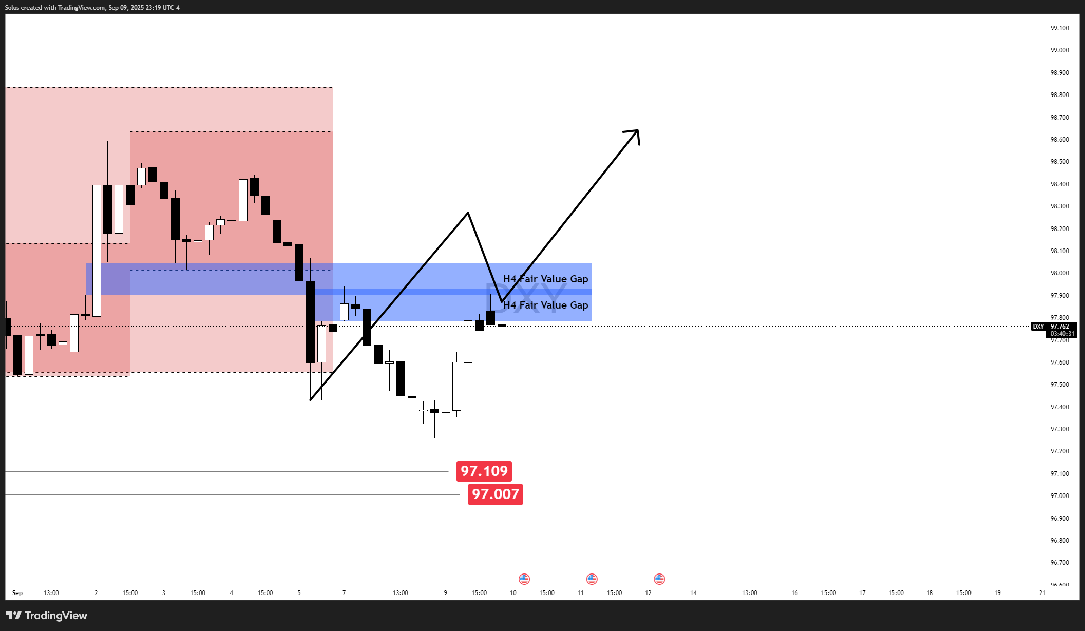 • Trigger: A sustained close above the 98 zone and the marked bearish H4 FVG.