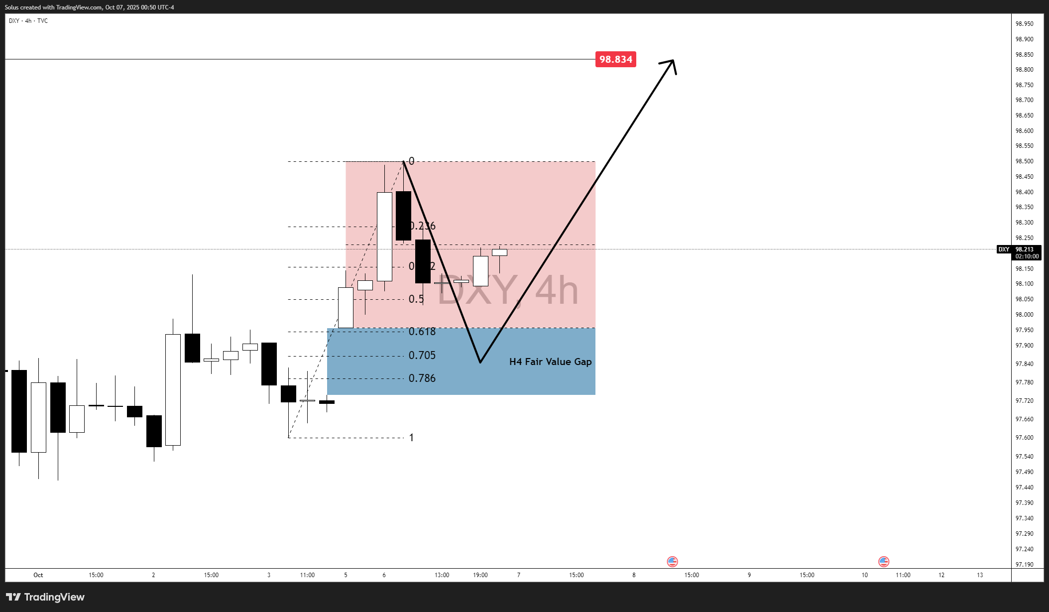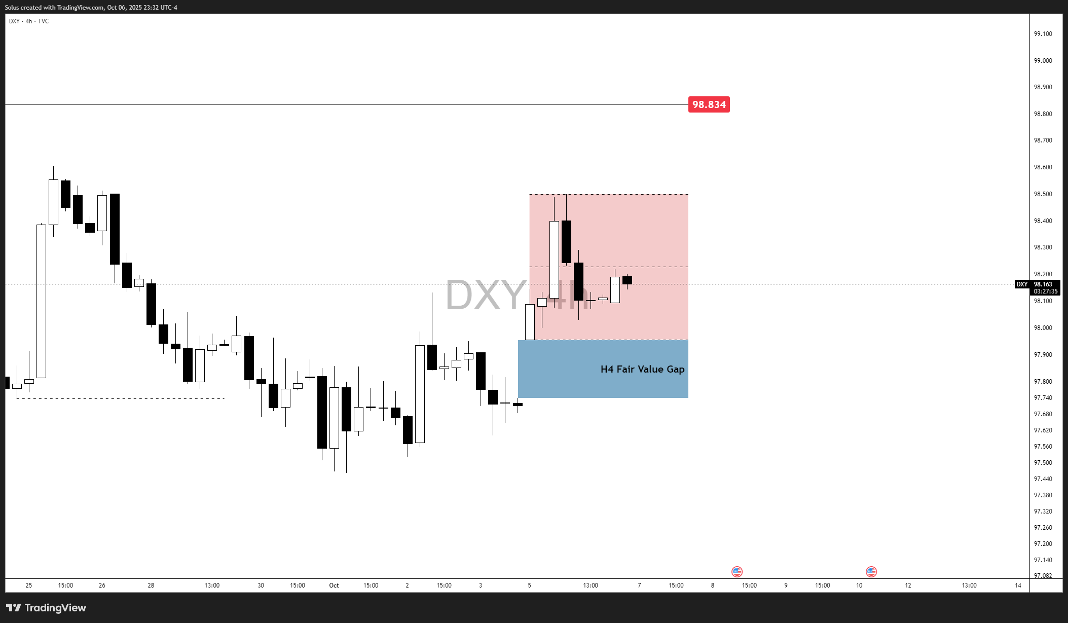 On the 4-hour chart, DXY is trading at 98.16, hovering just above its H4 Fair Value Gap (97.85–98.20) after reclaiming it late last week. This zone now acts as near-term support.