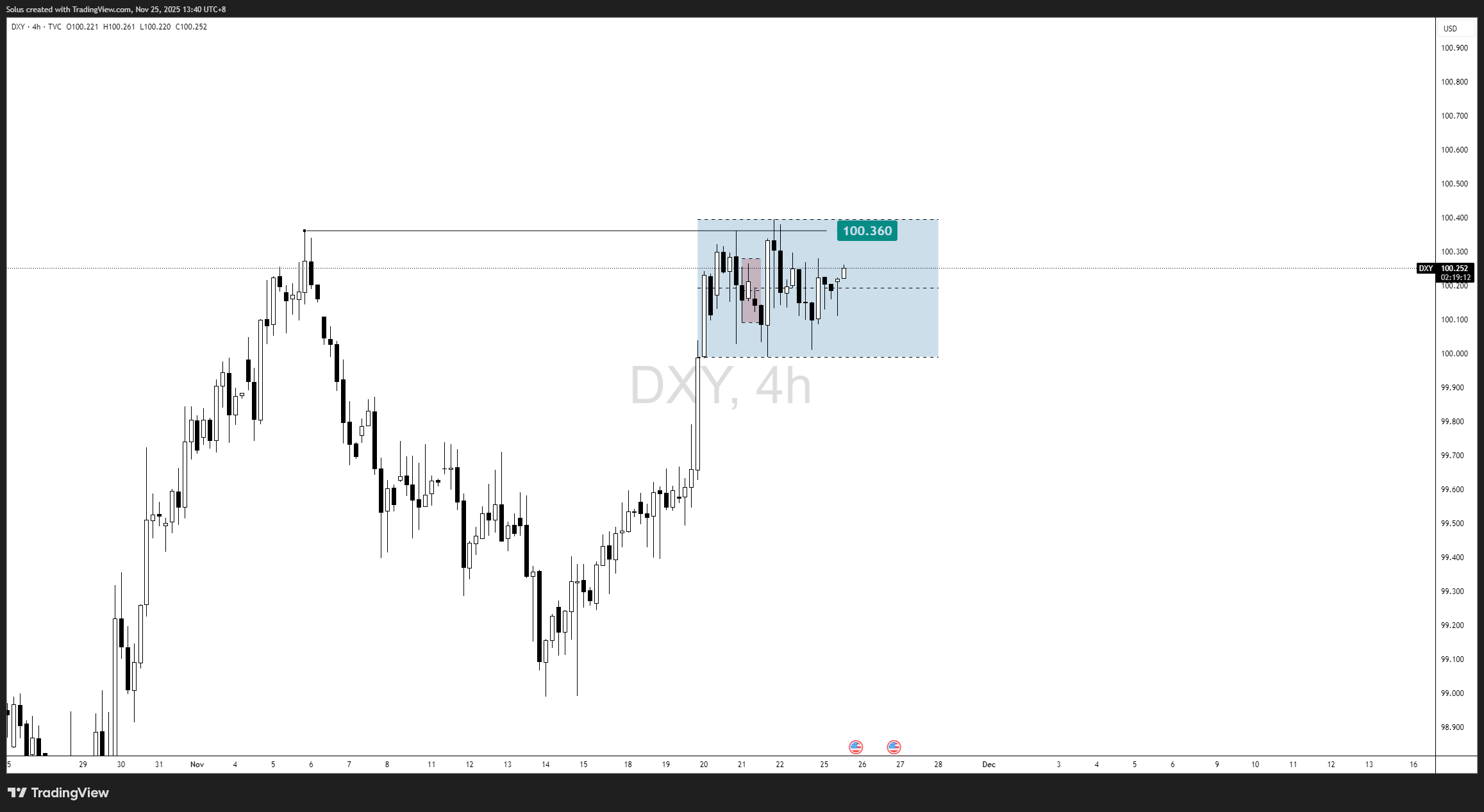 Price is coiling inside a 4H range between 100.00 and 100.36; whichever side gives way next sets the direction into December.