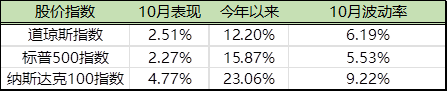 美国三大指数10月、今年以来的绩效以及10月波动率
