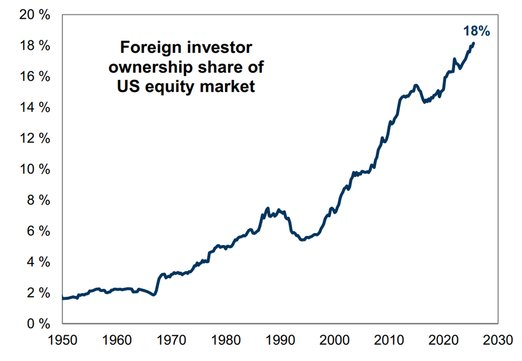 很多人说,川普的关税会导致通胀飙升,外国投资者会抛售美国资产,但事实证明他们错了,从4月到现在,通胀并没有大幅飙升,而且外国人反而不断买进美国资产,目前外国投资者持有美国股票的比例来到史上最高的18%,如果把所有美国资产,也就是说不只美国股票,现在外国投资者已经持有高达34万亿,目前这样的势头还不见停止的迹象。
