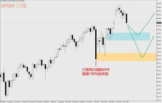 从标普500股指CFD来看,一直到10月30日还在创下历史新高,因此尽管进入11月前几日,股市有些许修正,或许反而提供多方再次进场的机会。图上的蓝色区块是潜在的支撑区(6650~6710),该支撑区是近期上涨波的50%费式数列、前一波修正波的等幅距离以及近期支撑/阻力互换区汇聚的地方。因此在短线交易上,我们可以重点关注如果修正到此区域,K线走势开始出现企稳的现象时,短线交易者或有考虑切入做多的机会。至于较长线有耐心的交易者,或许可等待更远的橘色支撑区(6490~6550)。