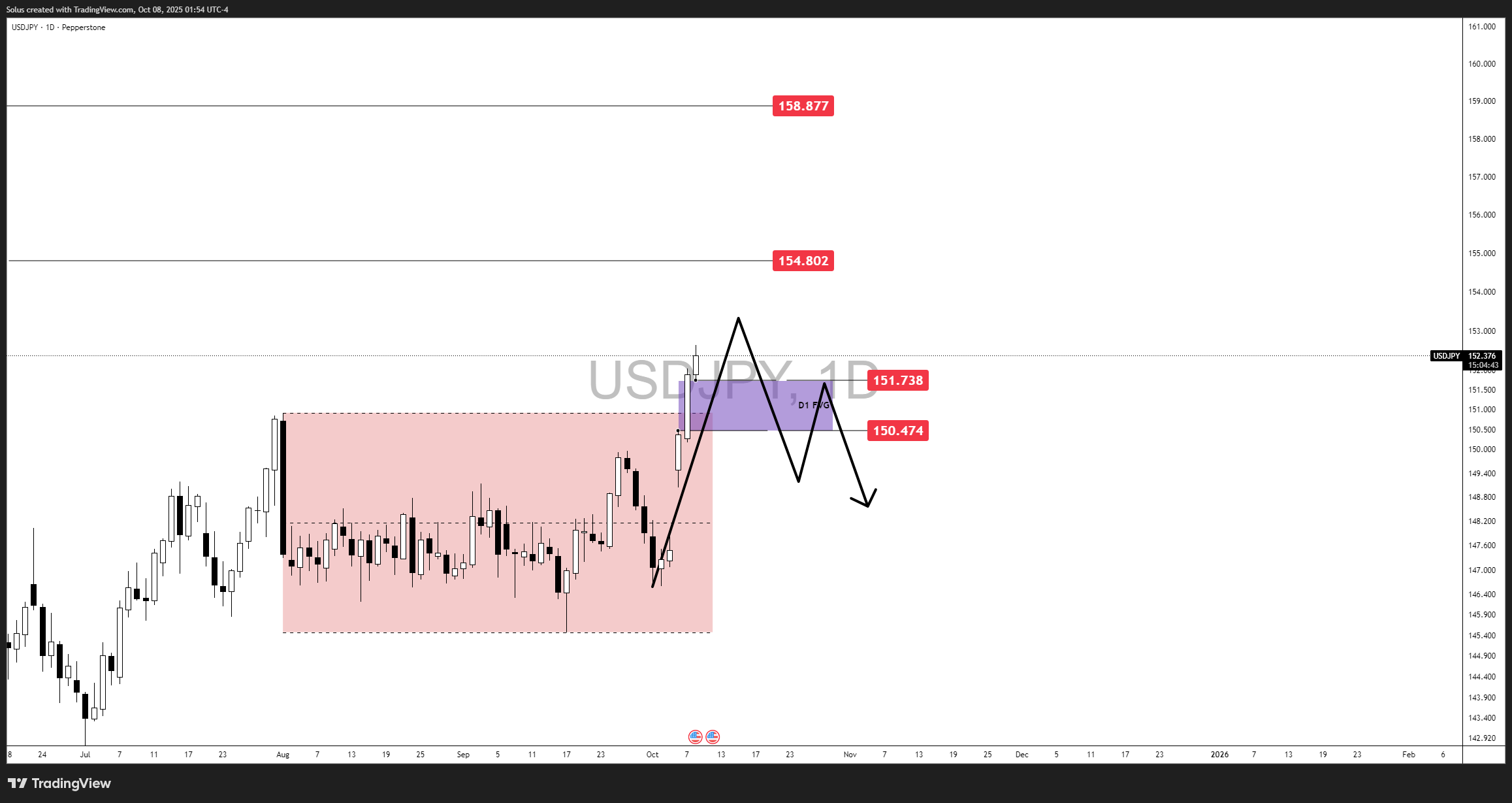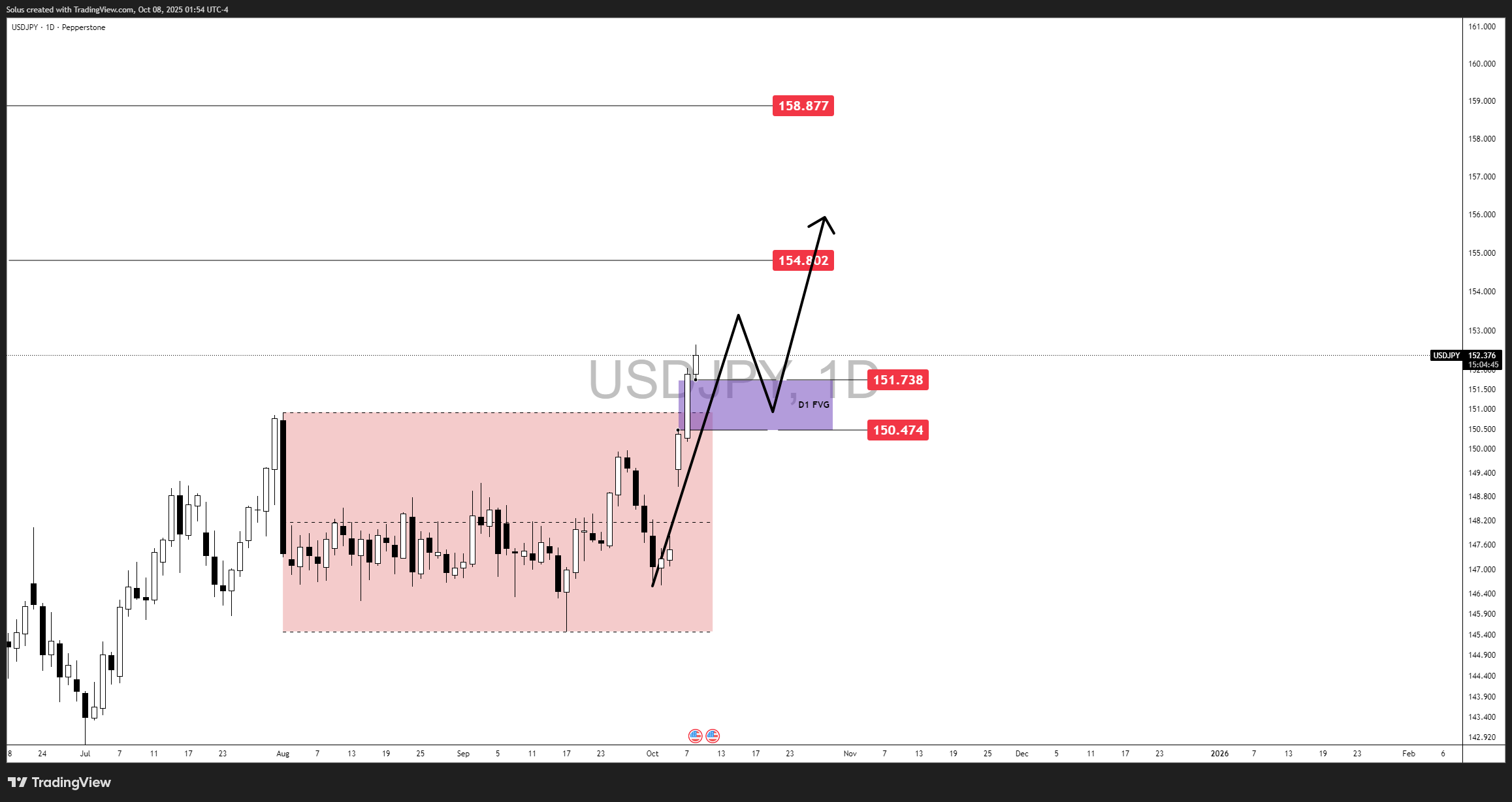 USD/JPY has broken above a two-month consolidation, reclaiming the D1 Fair Value Gap (150.47–151.73) and extending beyond 152. This FVG now serves as critical re-entry support, confirming that institutional order flow remains bullish.