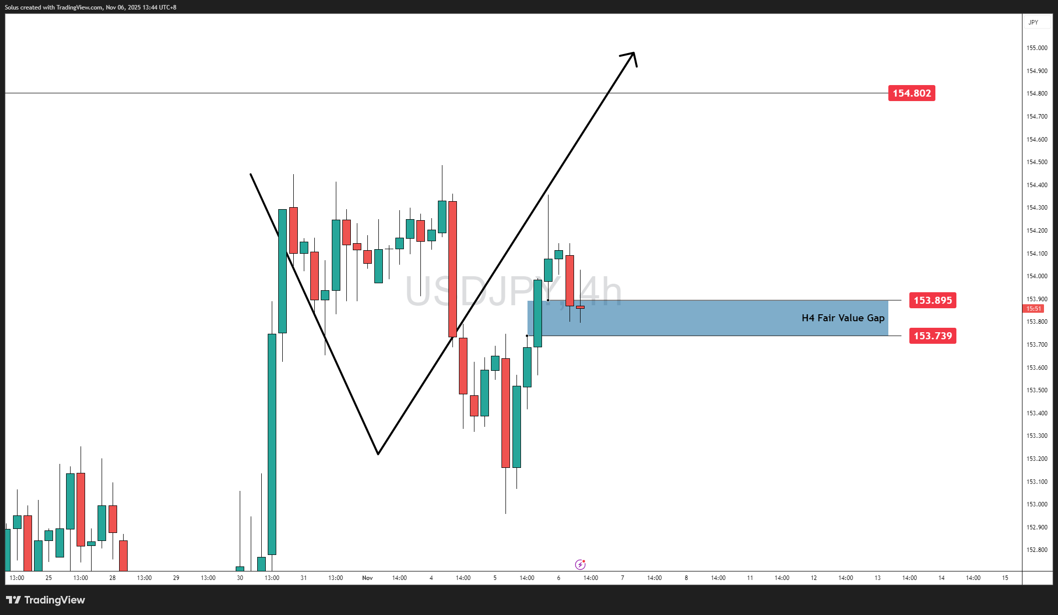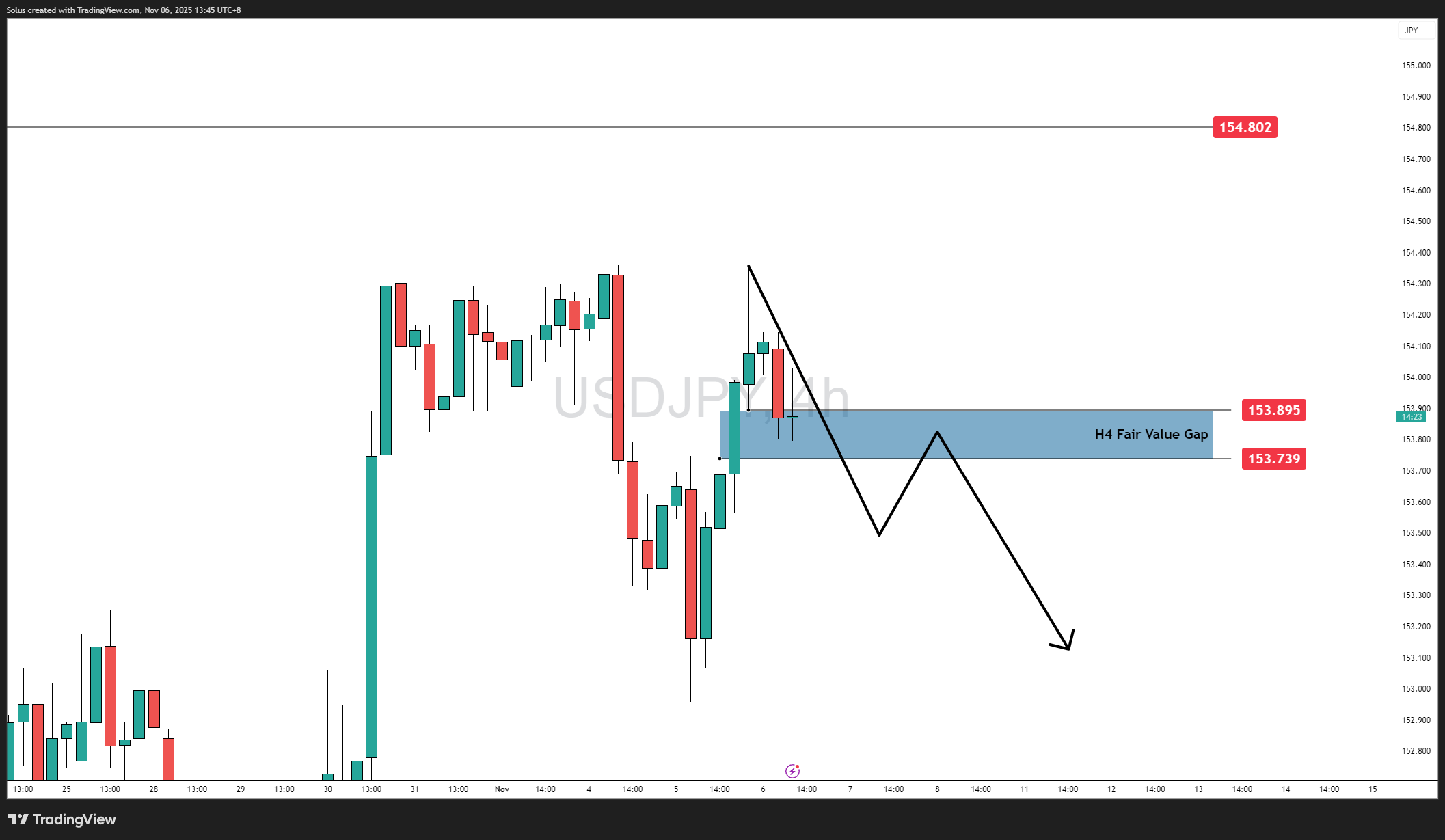 If the H4 Fair Value Gap holds, expect a rebound toward 154.80 followed by a potential extension into 155.30.