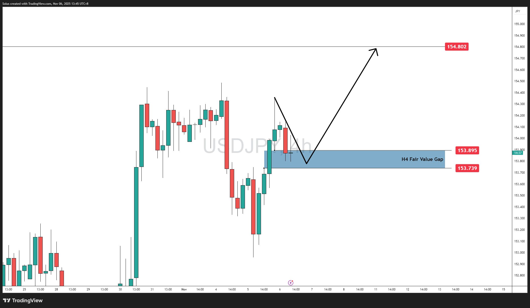 A rejection from this zone would confirm buyer presence and continuation toward 154.80, aligning with the prior swing high and liquidity cluster visible on the H4 chart.