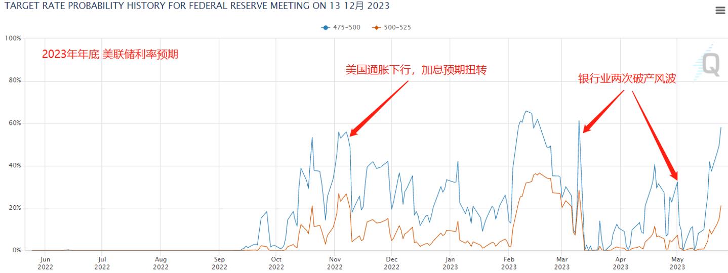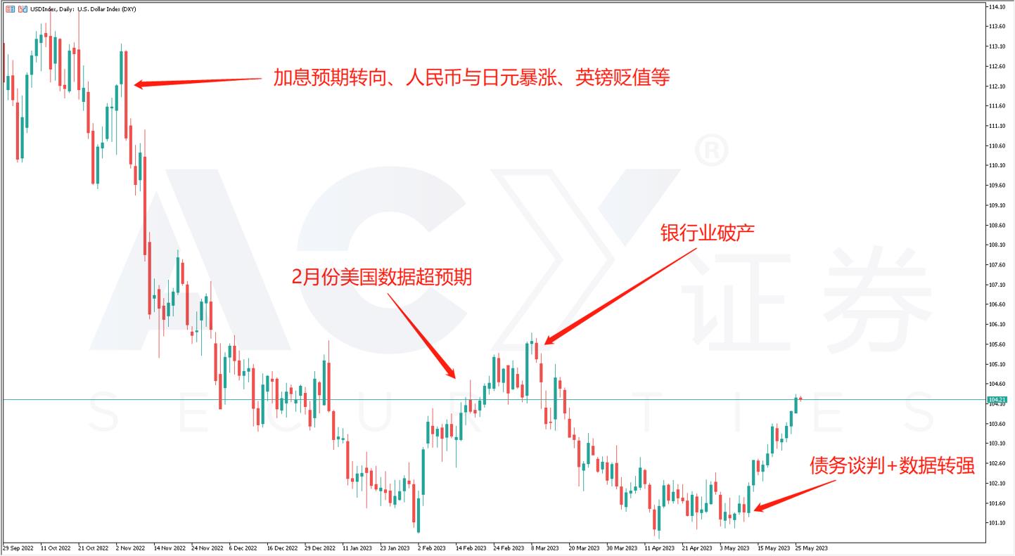 由图可见,市场对美联储年底利率的预期与美元指数的转折节点相吻合。让美元在去年11月和今年3月转涨为跌的关键,便是加息预期的同步见顶回落。近期的美元指数的暴涨,也符合加息预期的飙升。因此想要看空美元,关键就在于下一个令加息预期扭转的信号。从消息面来看,要么是核心通胀低于预期(例如今晚的核心PCE物价指数,但可能性不大),要么是银行业再度破产,而债务谈判成功同样对美元有短线利空影响。