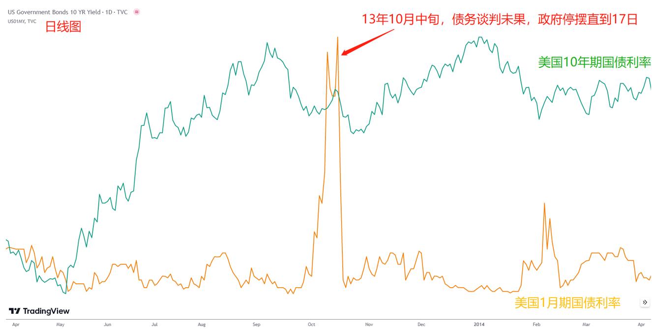 由图可见,2013年10月,债务上限谈判无果,美国政府从月初开始停摆,直到17日共和党让步。在此期间,短债利率暴涨,带动长债利率上扬。而在债务提高上限后,长短债利率均吐出了全部涨幅,美元也长债利率吐出涨幅。不过当时美元的波动根本不及当下的涨幅,美元汇率与长债利率的大幅飙升另有原因。