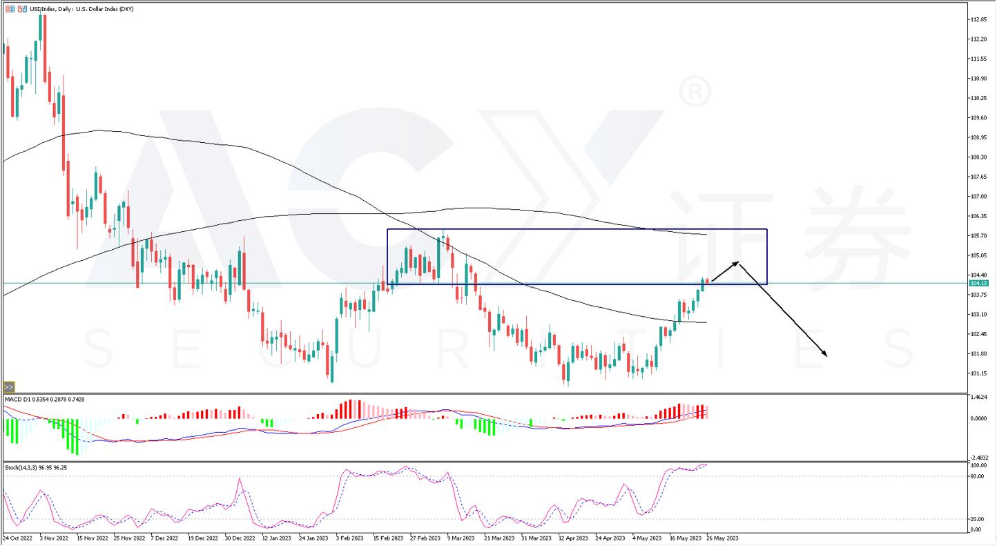 整体来看,对美元的观点还是保持一致。美元越往上走,承受的空头压力便会越大,短线最值得期待的利空信号,一方面是银行破产或股价暴跌,另一方面则是债务谈判成功。