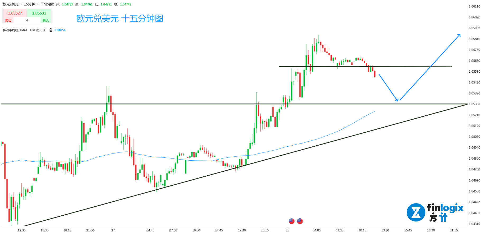 交易策略:(趋势跟随)回踩1.053附近看涨