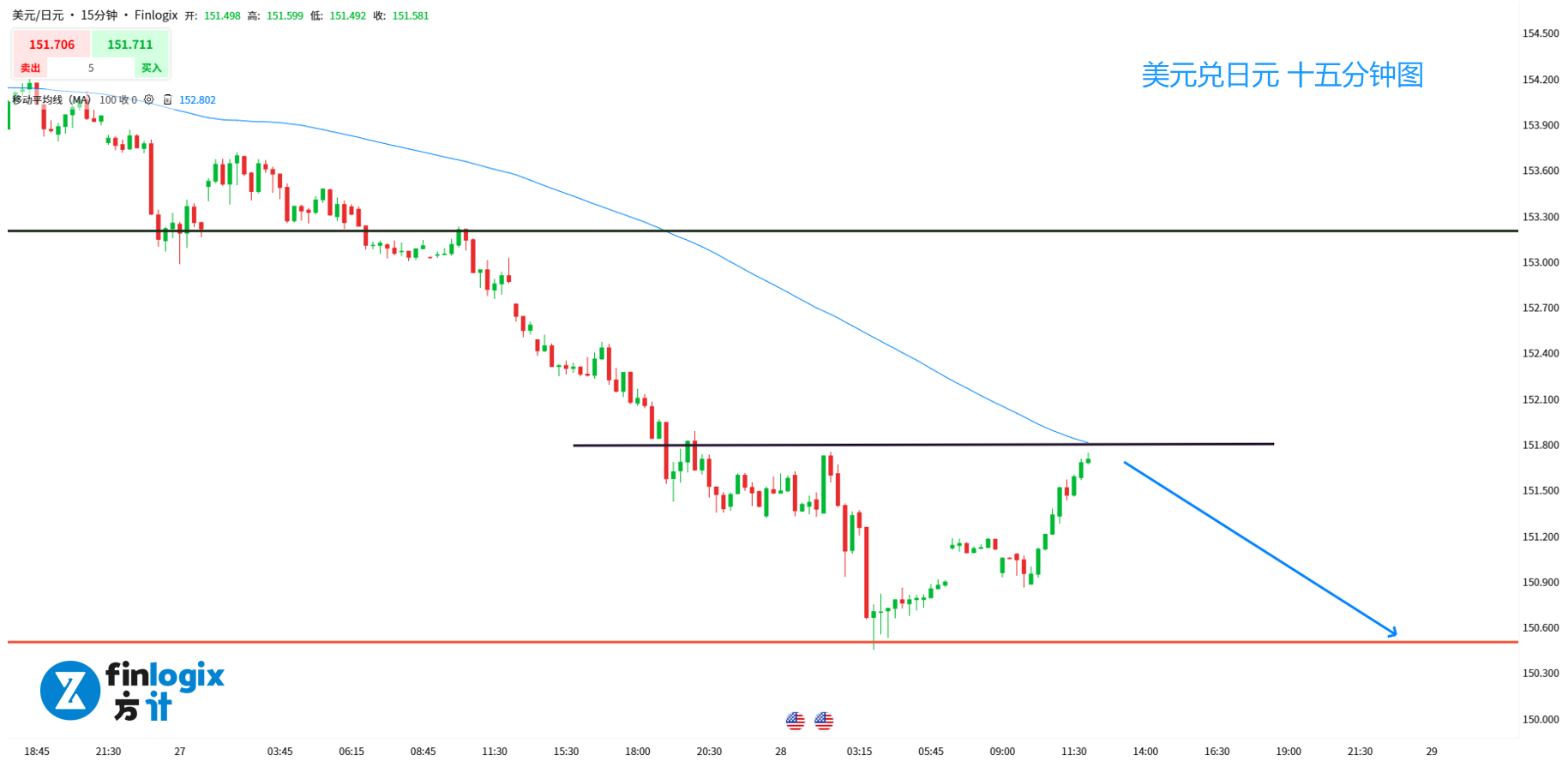 交易策略:(趋势跟随)151.8小止损做空,153.2逢高偏空