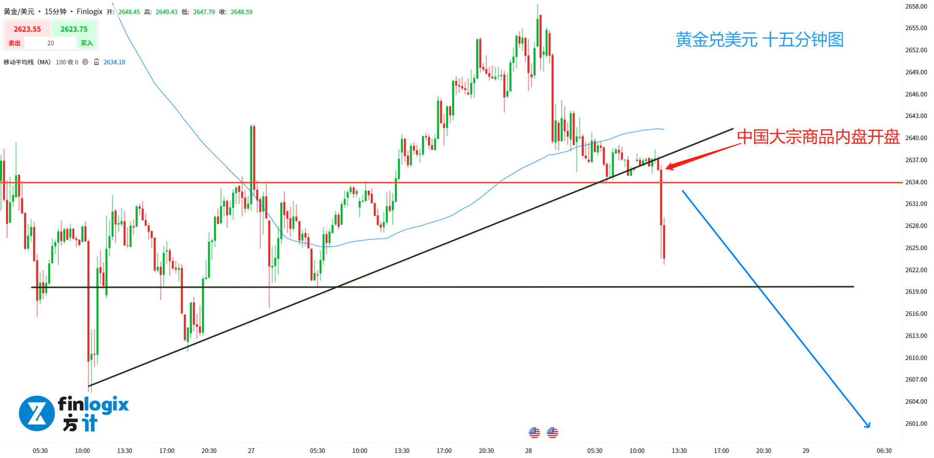 技术面:100均线开始趋平,说明价格存在转向可能。金价已经跌破了颈线2635关口,释放空头动力。同时考虑到大宗商品内盘开盘后,铁矿、原油与黄金同跌,今日中国股市的表现更可能出现回调。因此黄金的交易方向还是以顺势做空为主。如果A股开盘上涨,则黄金可能回踩2630的阻力。