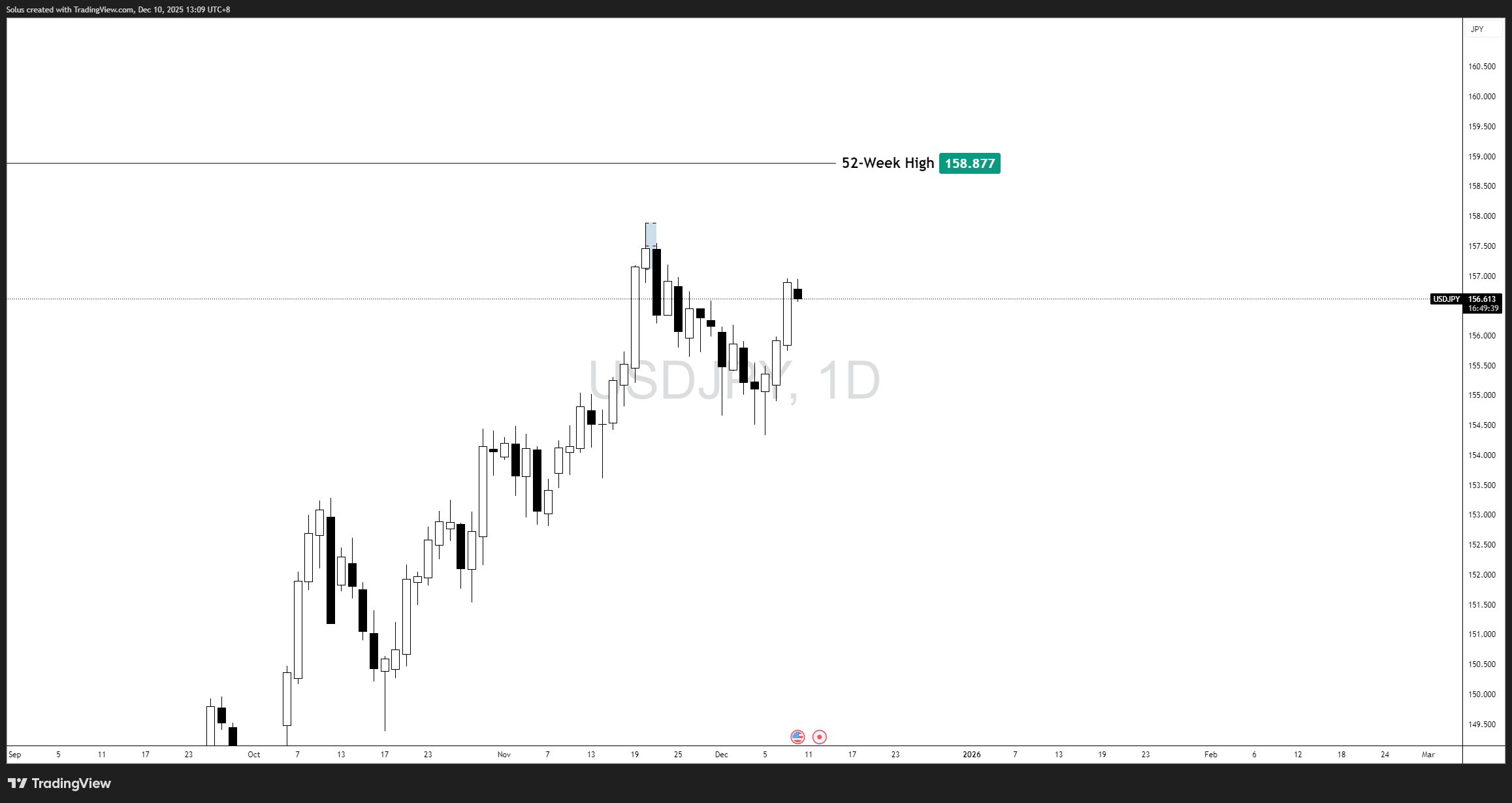 The daily chart shows a clean reaction after the November sell-off, but price remains below the major swing high at 158.877, which represents the 52-week high and a key psychological barrier where the BOJ previously intervened.