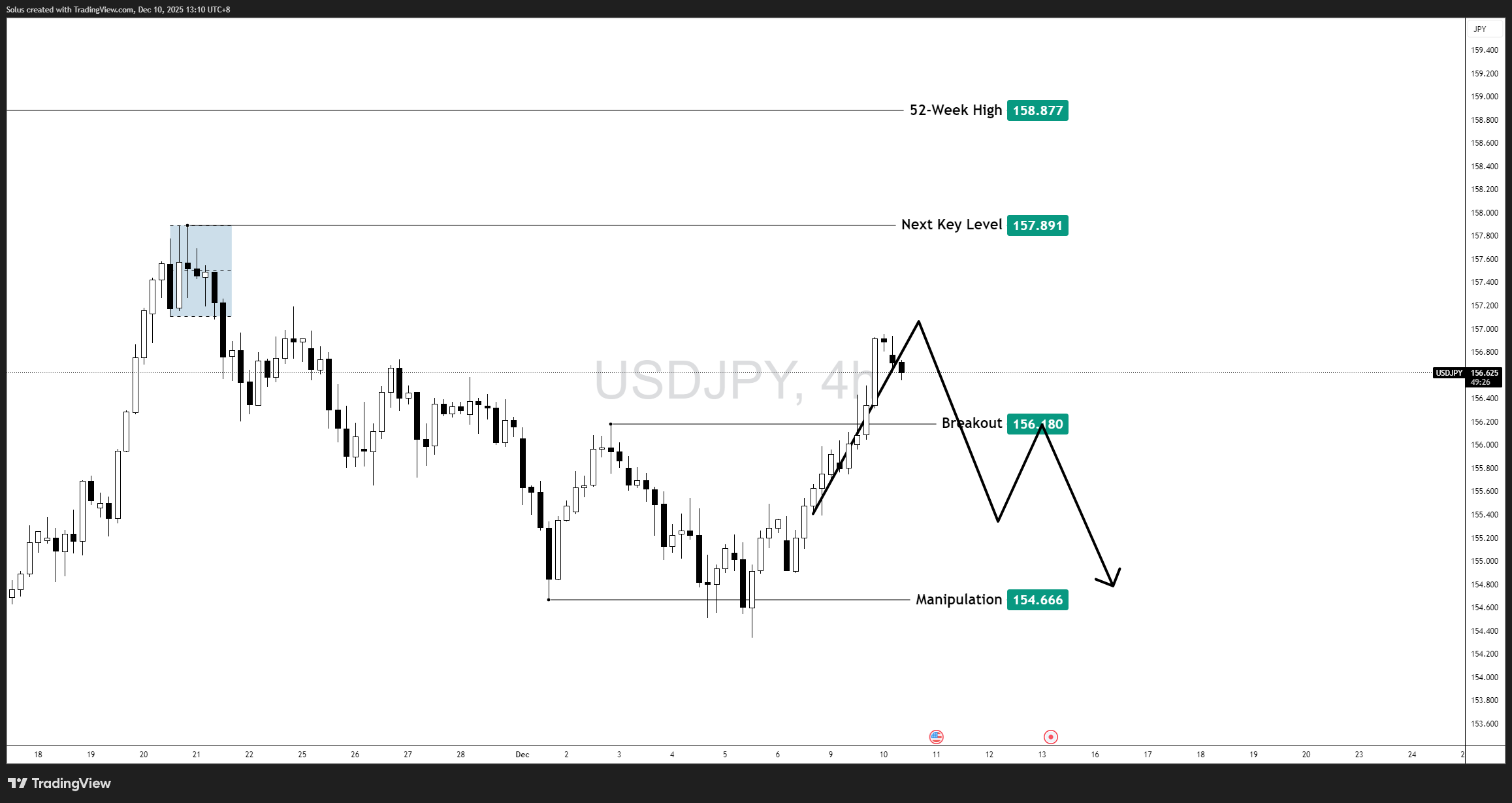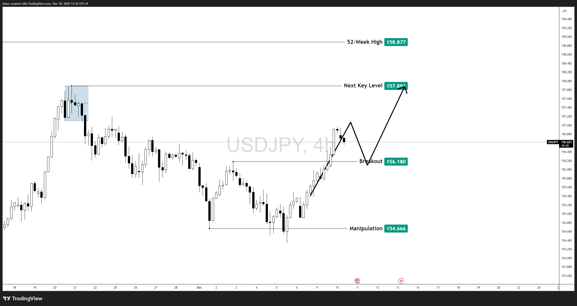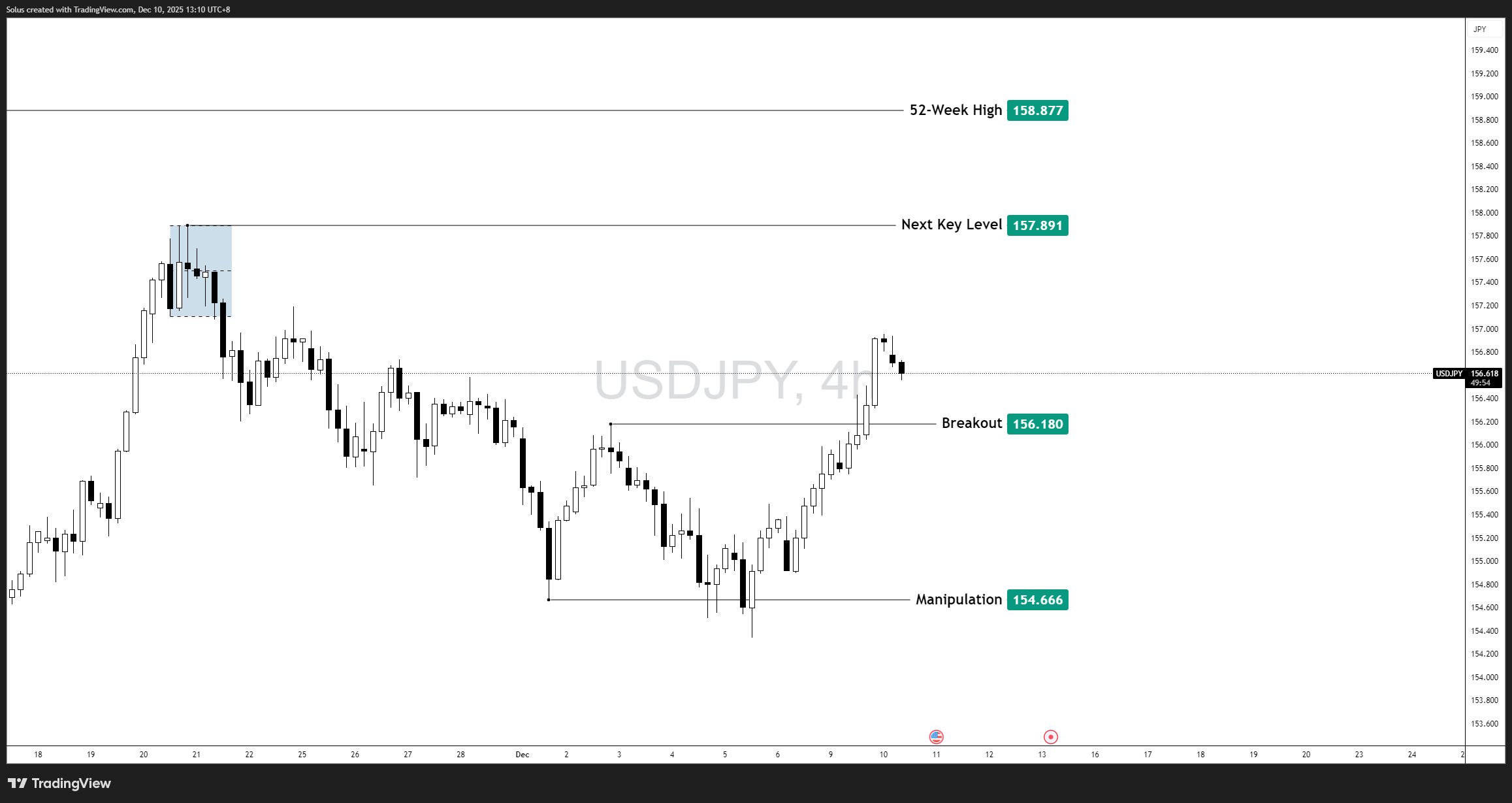 • 156.18 and 157.89 remain the critical levels that decide whether USD/JPY retests its 52-week high at 158.88 — or rotates into a deeper correction.