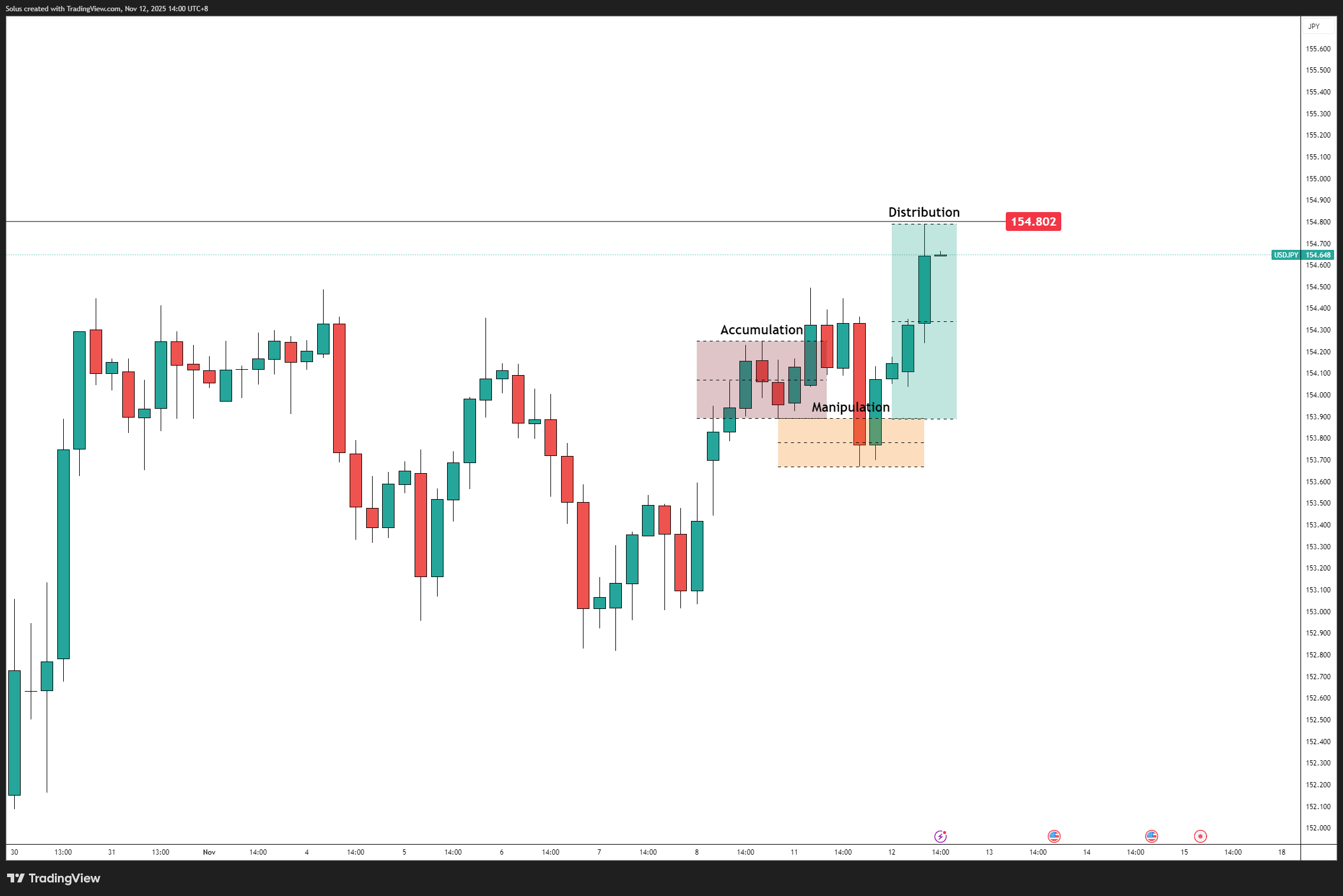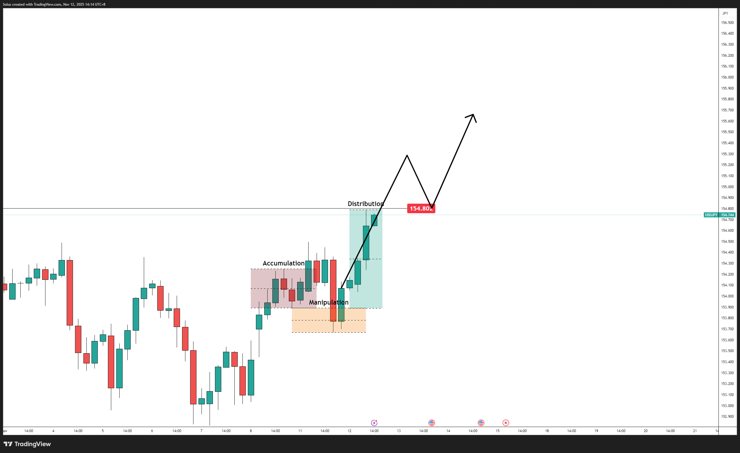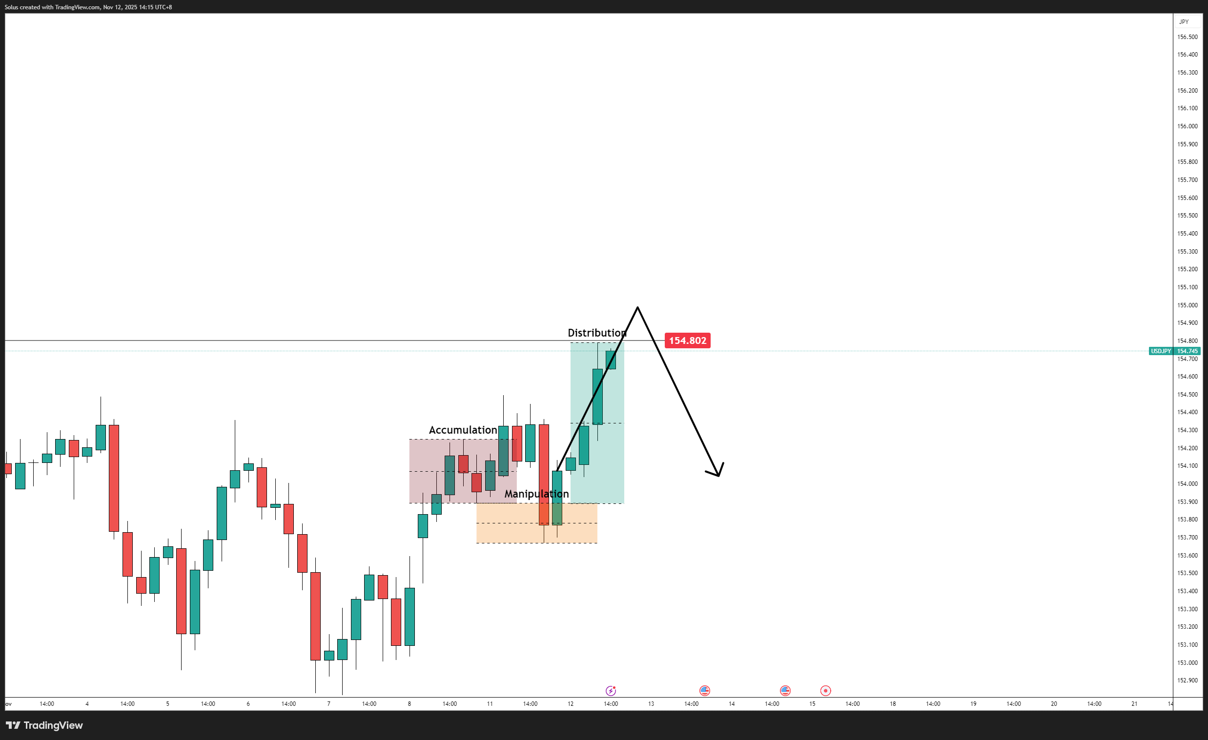Technically, USDJPY is consolidating after a strong rebound from 153.70–153.90 support, now hovering near 154.80, where prior liquidity and short-term distribution zones are visible.