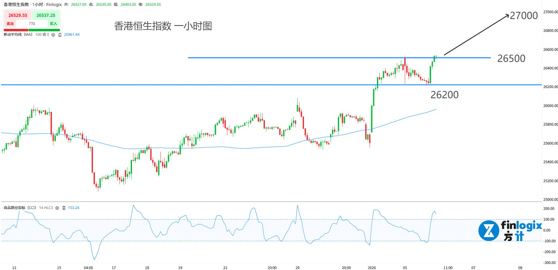 技术面:100均线向上,多头动能强劲,现价在26500关口形成价格静区,需要等待突破方向。如果今早开盘半小时内,恒生指数能够站稳26500关口,就应该是以回踩或跟随看涨为主。波段交易如果看到CCI回到中心区域就可以考虑止盈平仓。