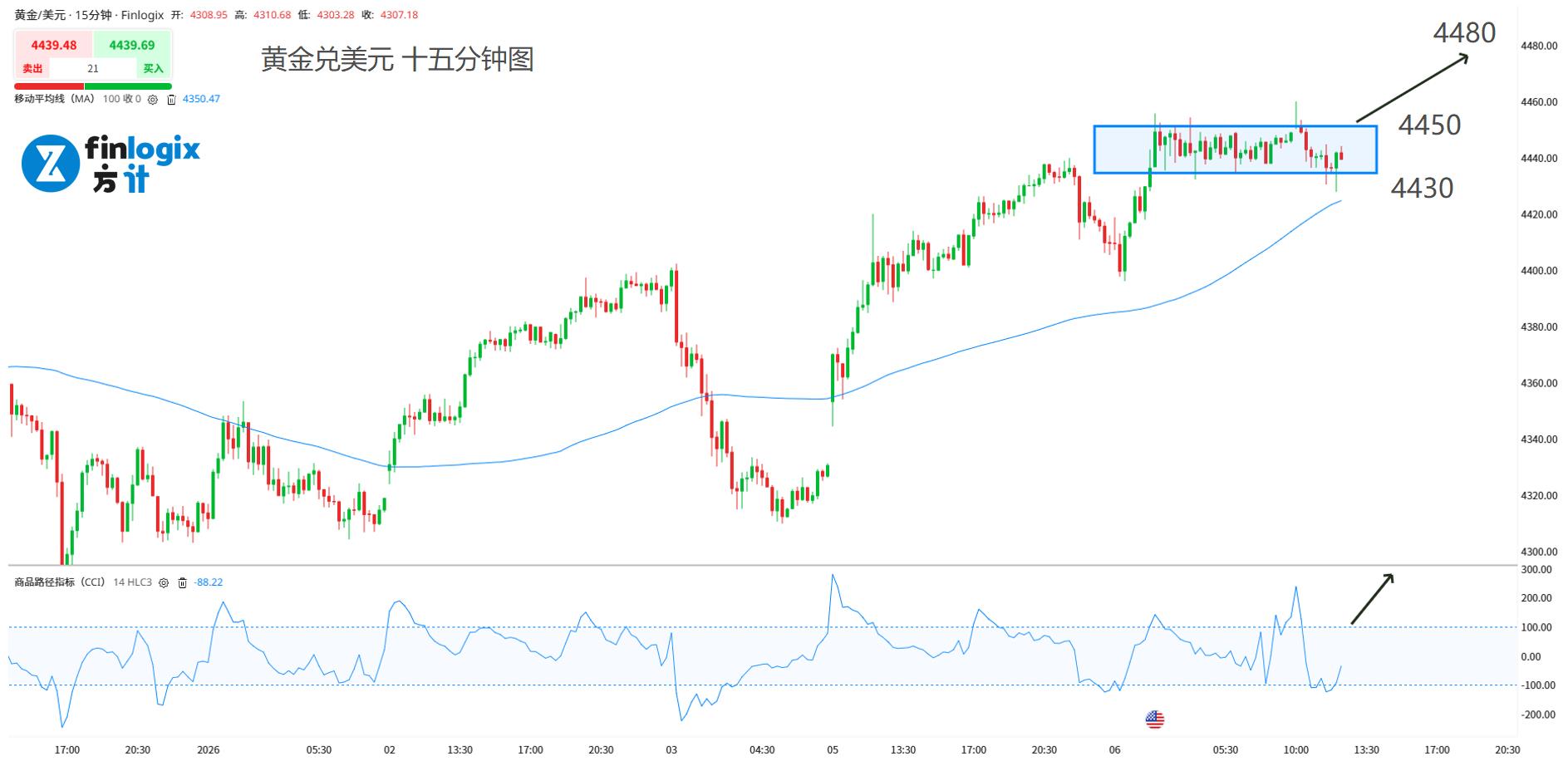 技术面:100均线向上,多头占据主导,交易方向以多单为主。现价在4450下方形成价格静区,突破方向将决定亚盘走向。交易策略以突破跟随为主。入场时机可以配合CCI上穿+100线的多头信号。如果亚盘跌破4430,多单可以等待价格回调至4400关口。