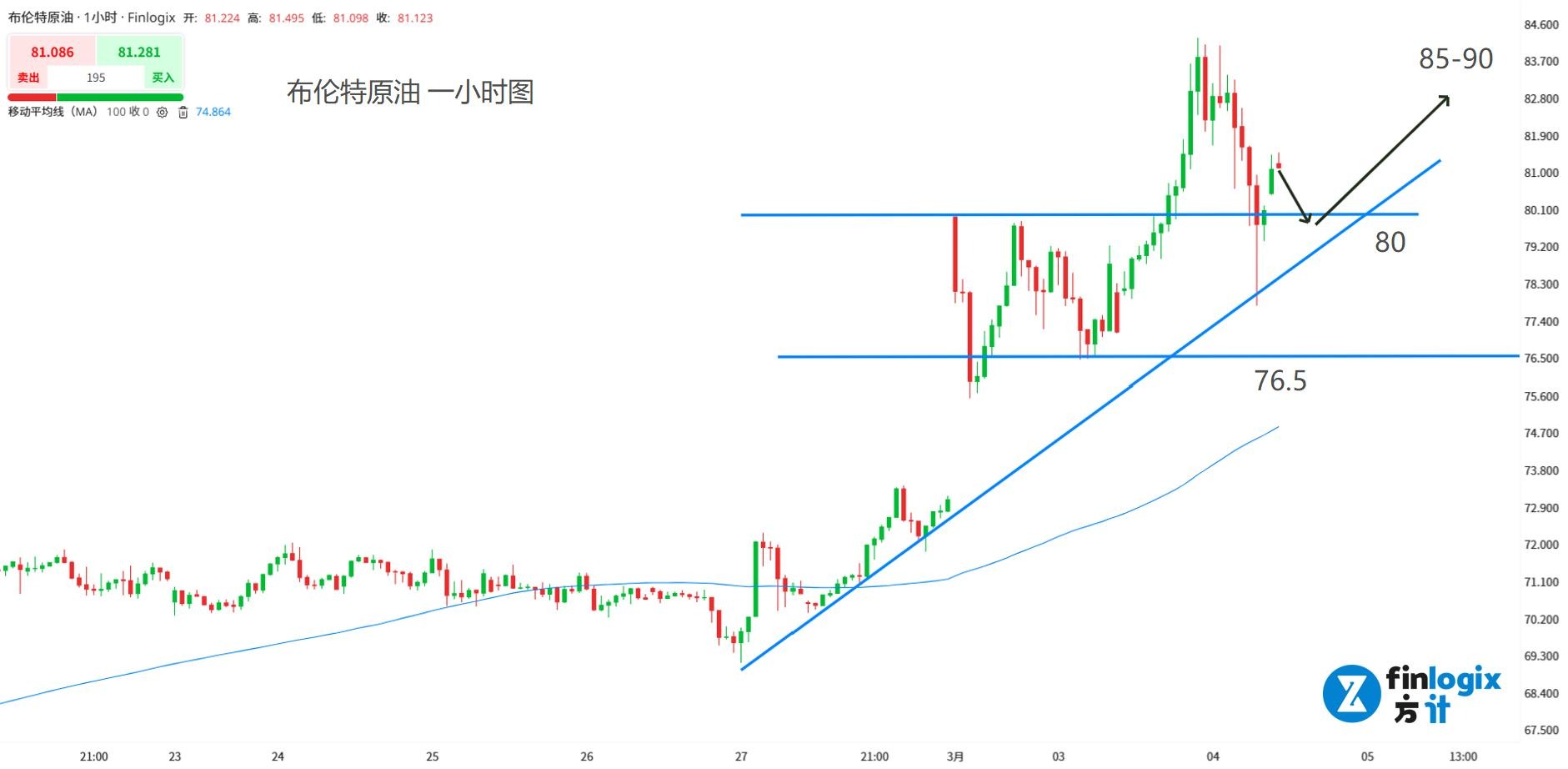 技术面:100均线向上,趋势线和跳空缺口提供支撑。交易策略以回踩看涨为主。目标价格根据美伊冲突的严重程度进行调整,短线目标以前高点为主。