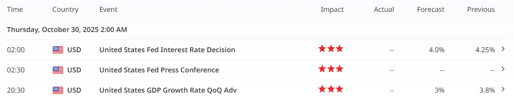 • Oct 30, 2:00 AM – FOMC Rate Decision (4.25% → 4.00%)