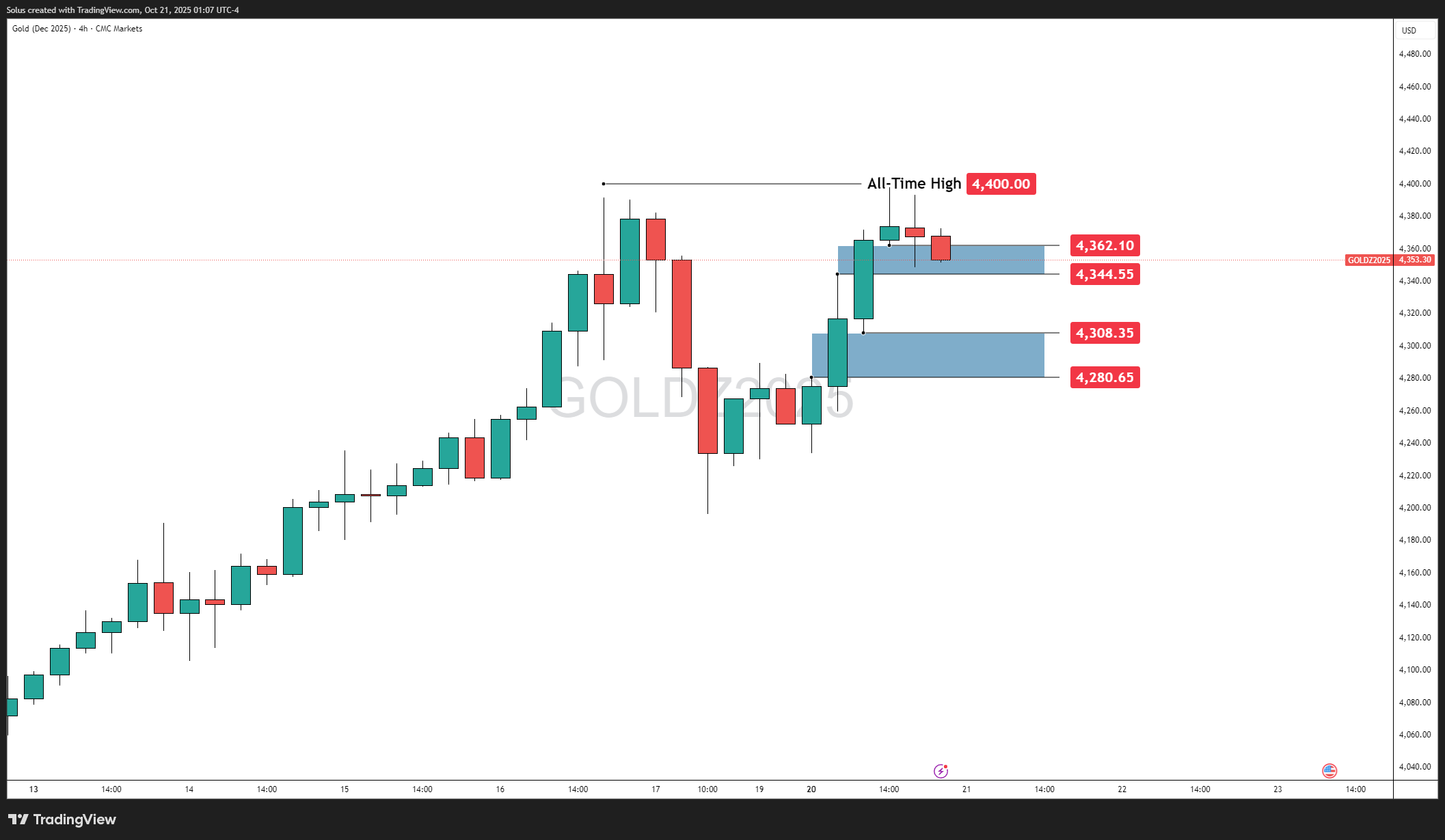 Gold’s 4H structure remains clean and bullish. After printing the $4,400 all-time high, price has pulled back modestly into a tight $4,340–$4,360 consolidation zone, resting just above two well-defined Fair Value Gaps (FVGs).