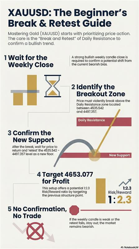 My preferred bullish case requires the price to violently break the daily resistance. After that breakout happens, you must watch for a successful retest of the 4535.542 - 4497.357 zone to confirm the newly found support. Once that floor holds, we target the 4653.077 level for maximum profit.