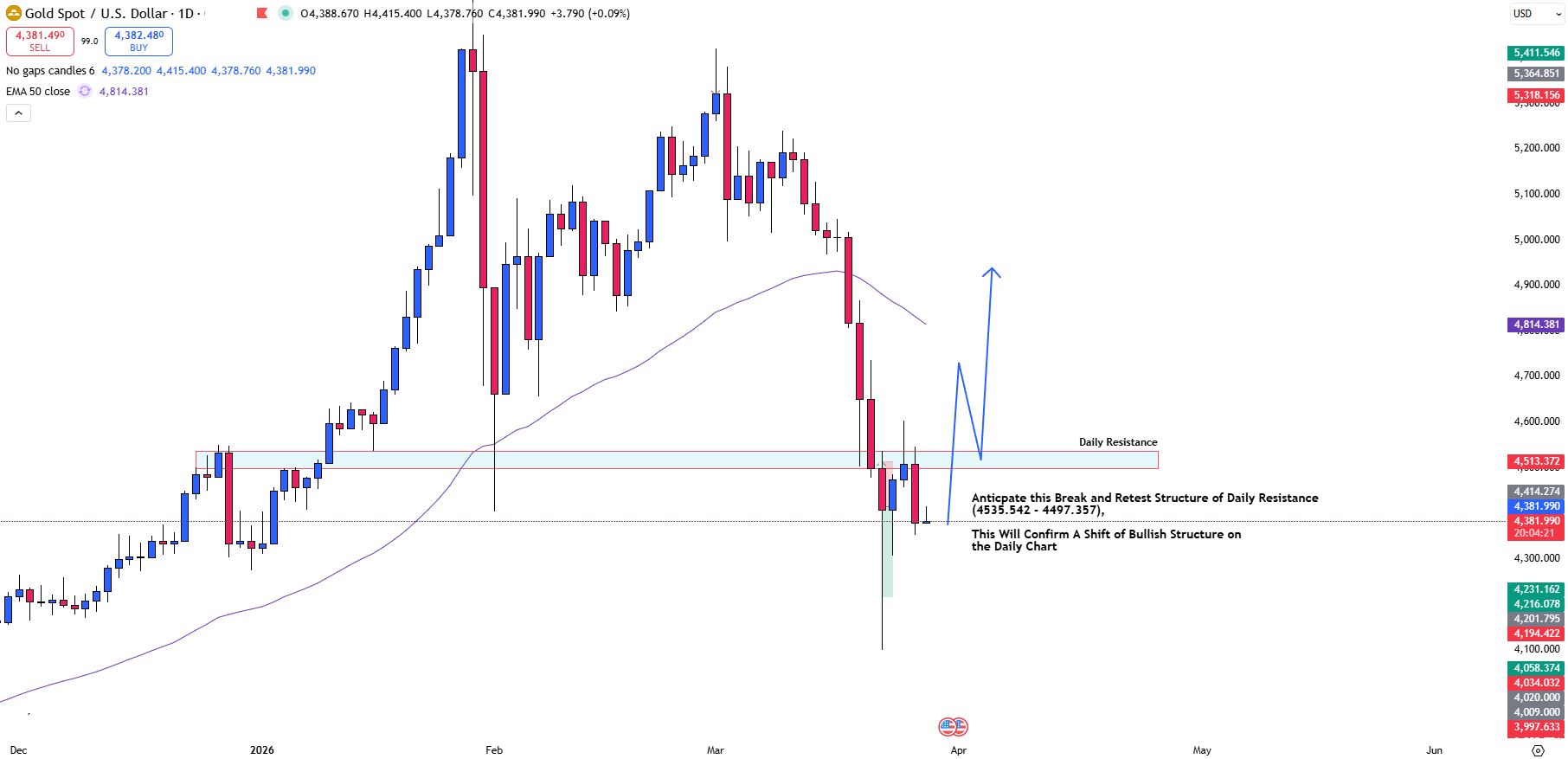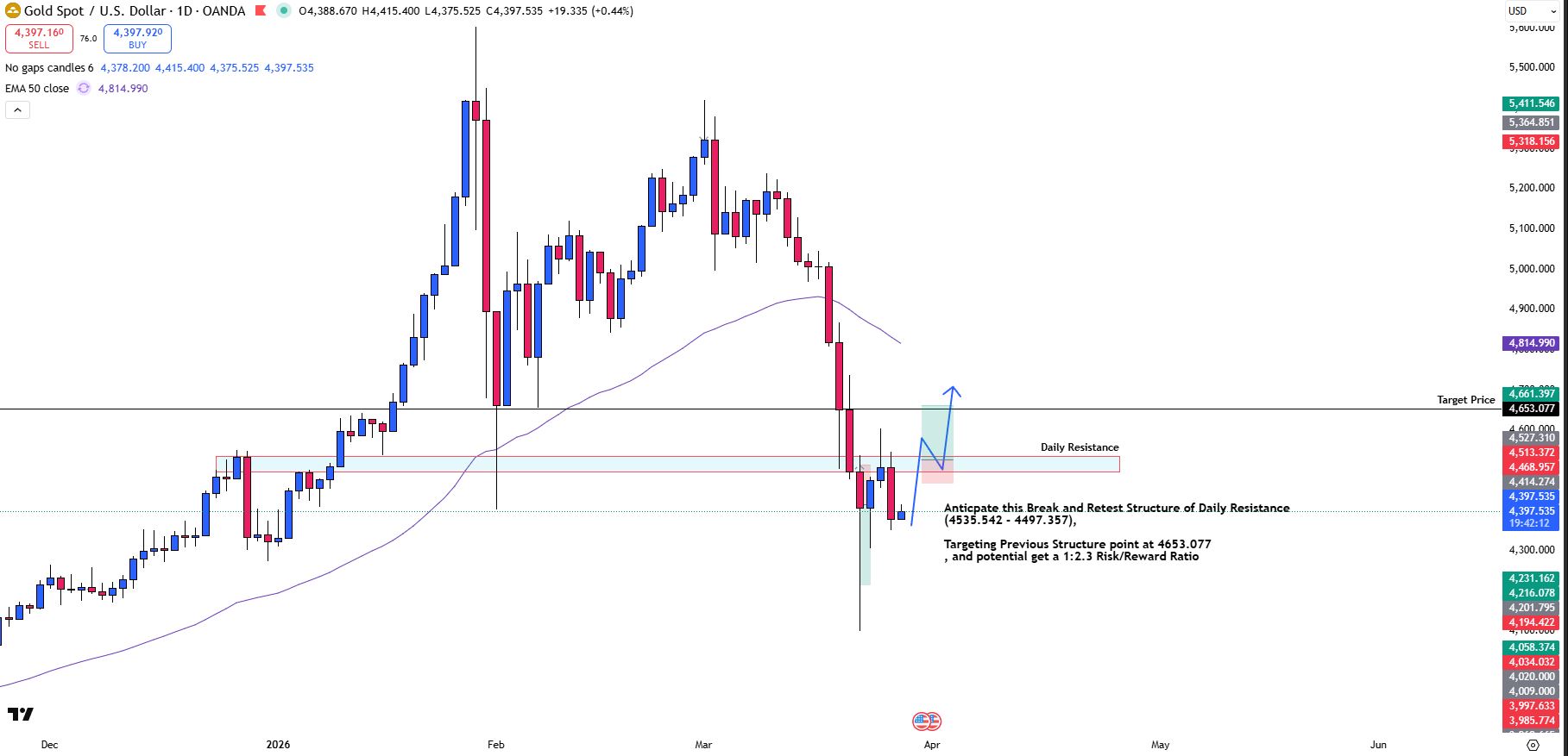 Upside Anticipation: If bullish momentum continues, XAUUSD could break the daily resistance and retest the 4535.542 - 4497.357, and target 4653.077