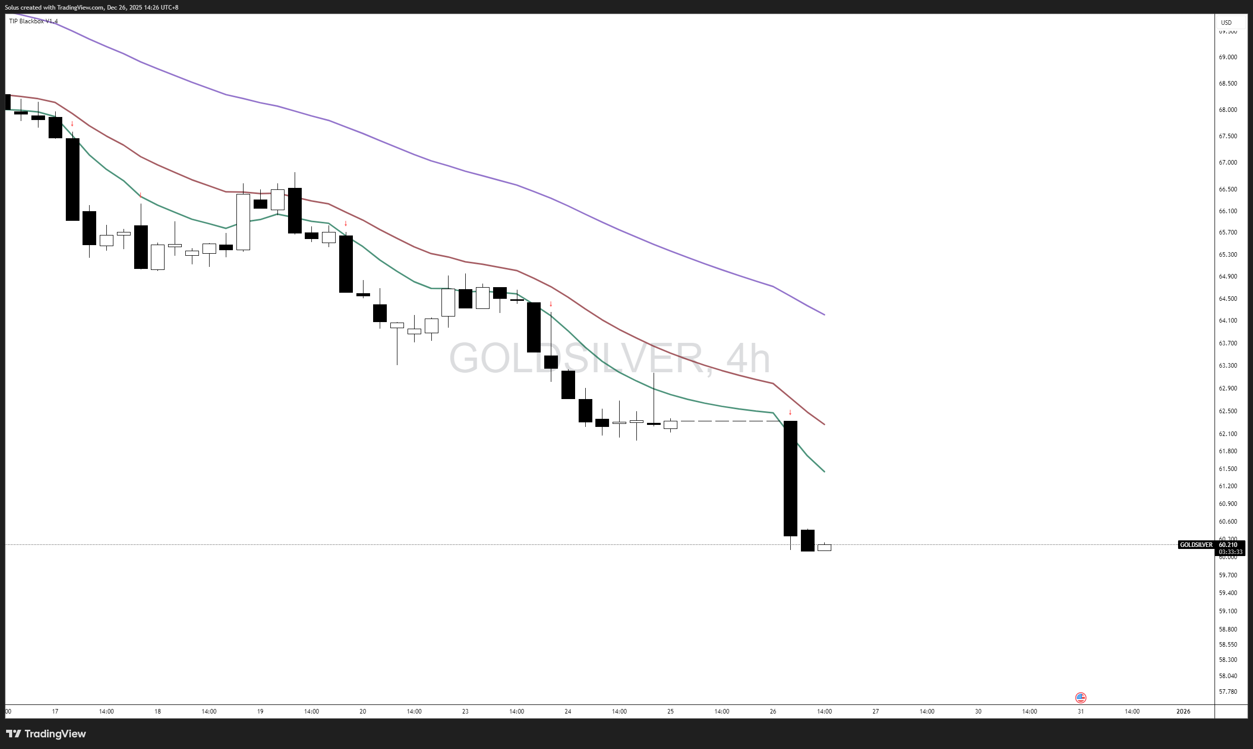 On the 4H timeframe, precious metals are showing clear bearish structure, with price continuing to respect dynamic resistance and failing to reclaim short-term moving averages.