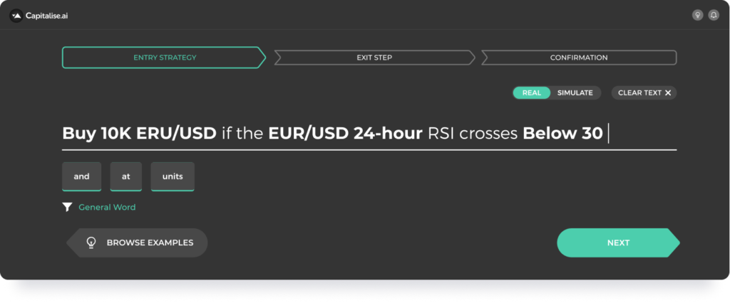 As an example, let’s think of a trader who waits for the RSI of a certain asset to cross below a certain level in order to enter a long trade. Automating such trade is as easy as writing “Buy 10K EUR/USD if the EUR/USD 24-hour RSI crosses below 30”