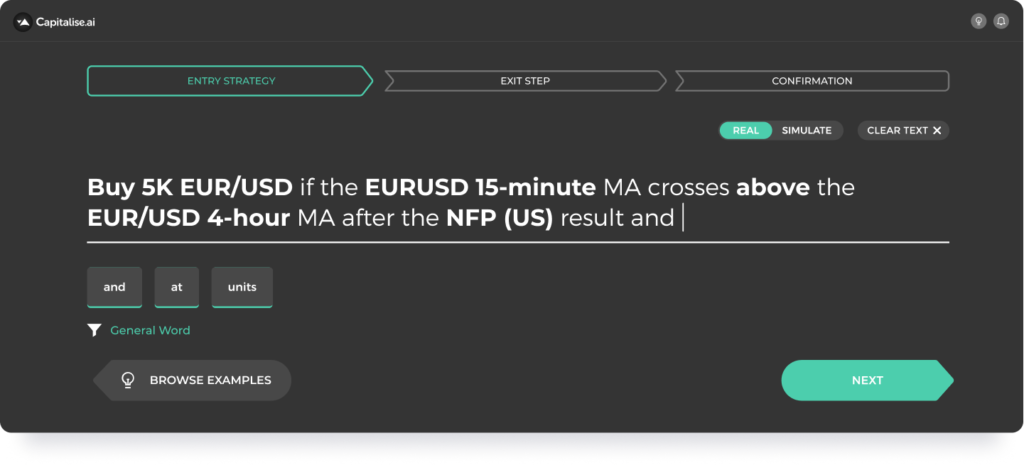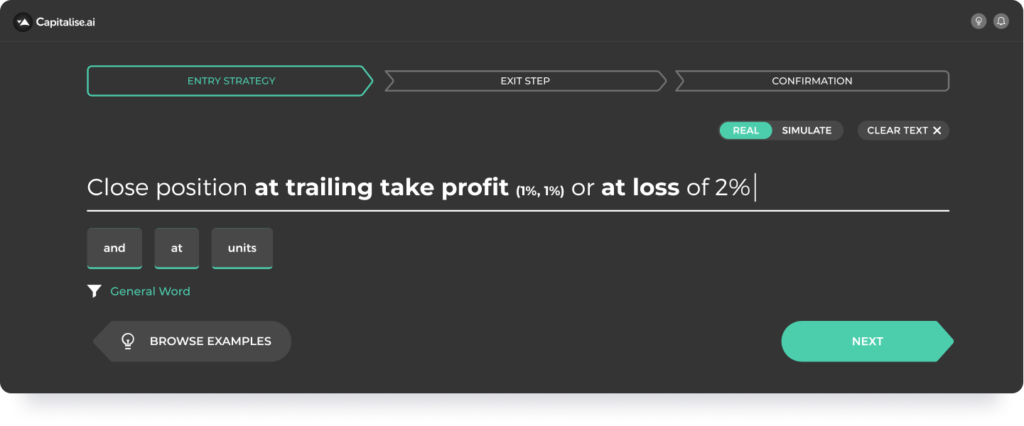 Whatever you’re waiting for to happen can be easily set as a condition that will seamlessly open and close your next trade. Don’t wait any further to start saving time, avoid emotional decision-making, and become as fast and precise as a machine. Simply log in to your Capitalise.ai account, type your trading strategy in natural everyday English and let Capitalise.ai monitor the markets 24/7.