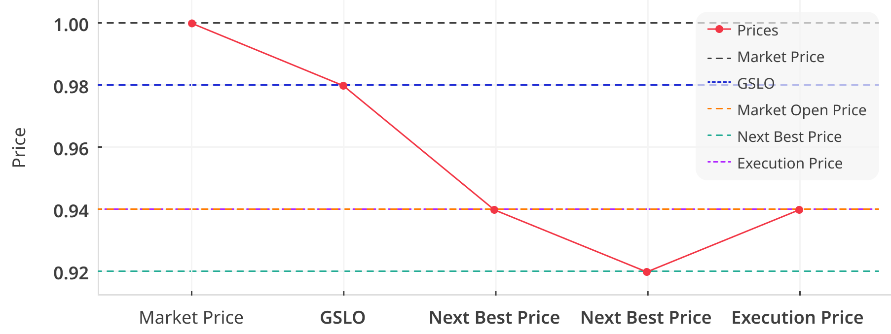 In this scenario, the market open price is 0.94 which is a gap of 0.06 from the market close of 1.00. The next best price is 0.92 however, we have executed your order at the market open rate of 0.94 and covered the 0.02 slippage. We do not cover the gapping.
