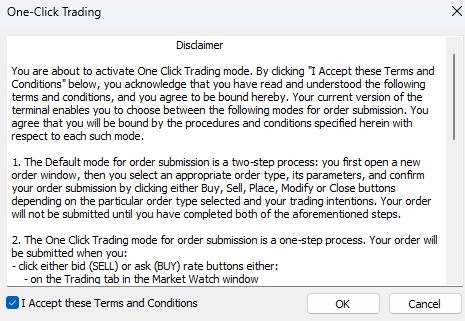 • One-click trading in MT4 is versatile and efficient and there are no limitations to use it except for accepting the terms and conditions of one click trading when it pops up. Please read them thoroughly.