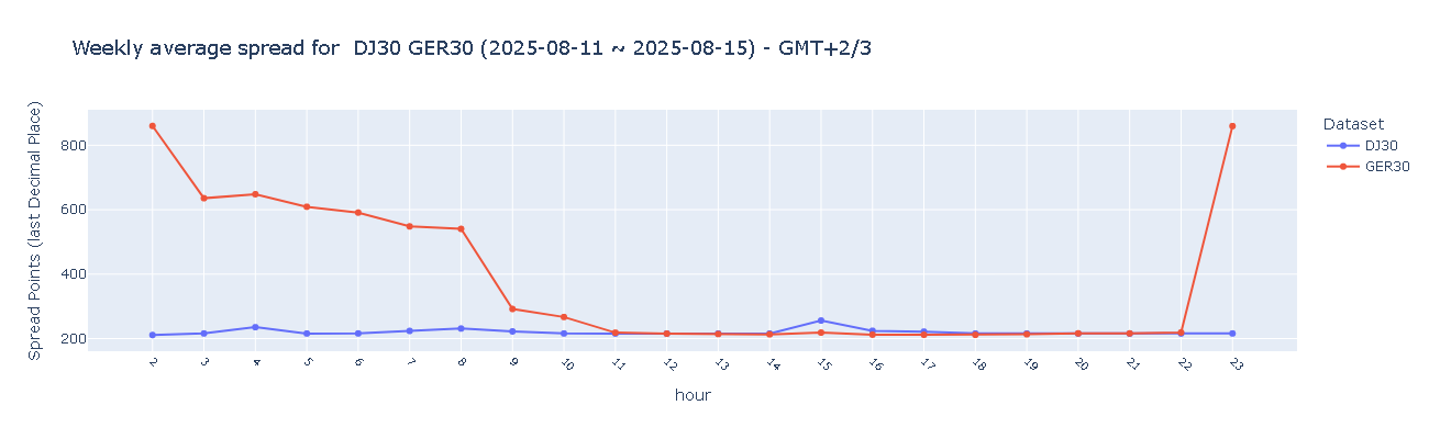 GER30 (German 30 Index) maintained Good spreads (200–300 points) during the European session, widened to Average (300–500 points) in the US session, and deteriorated to Improvement Required (>500 points) in the Asian session, highlighting strong time-zone dependency in trading conditions.