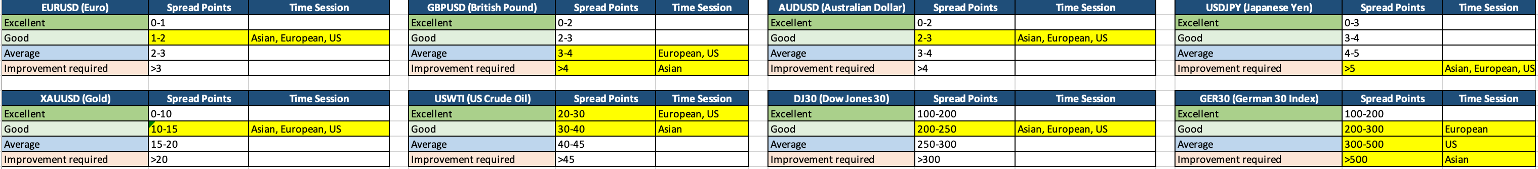 USDJPY (Japanese Yen) recorded Improvement Required spreads (>5 points) across Asian, European, and US sessions, indicating persistent volatility and higher trading costs across all trading hours.