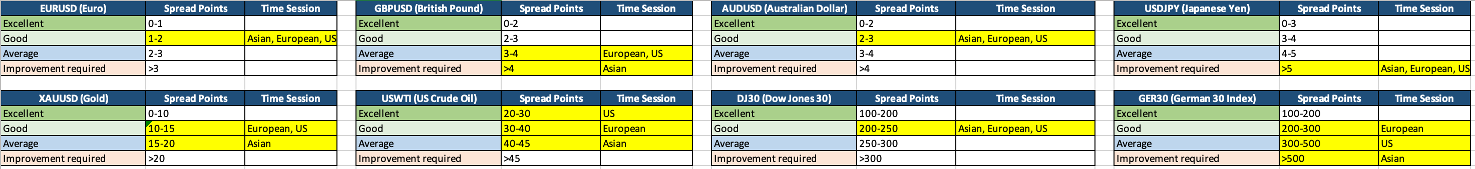 GBPUSD (British Pound) with spreads widening to Average (3–4 points) in the European and US sessions. During the Asian session, spreads increased further to Improvement Required (>4 points), indicating higher trading costs in Asia.